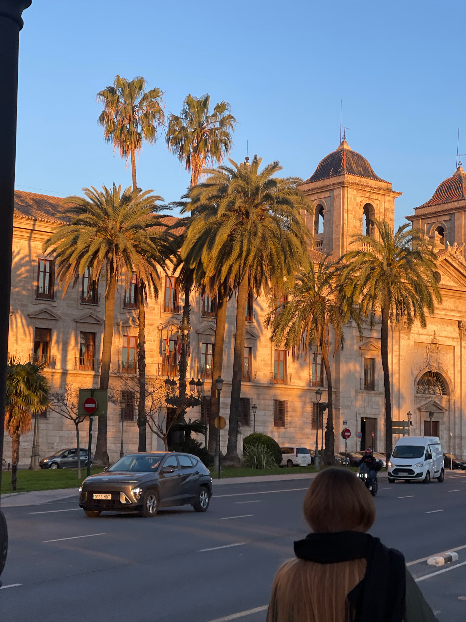A low-angle street-level shot depicts a building with rows of windows and palm trees along its exterior. Two domed towers rise from the building. Several vehicles are on the road, including a white va…read more