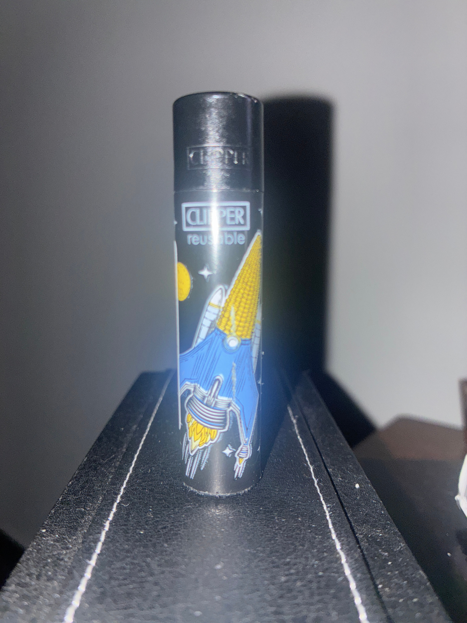 The image shows a black Clipper lighter with a spaceship design lying on a black surface. The lighter is cylindrical and displays the word "CLIPPER" and "reusable." The spaceship is predominantly blue…read more