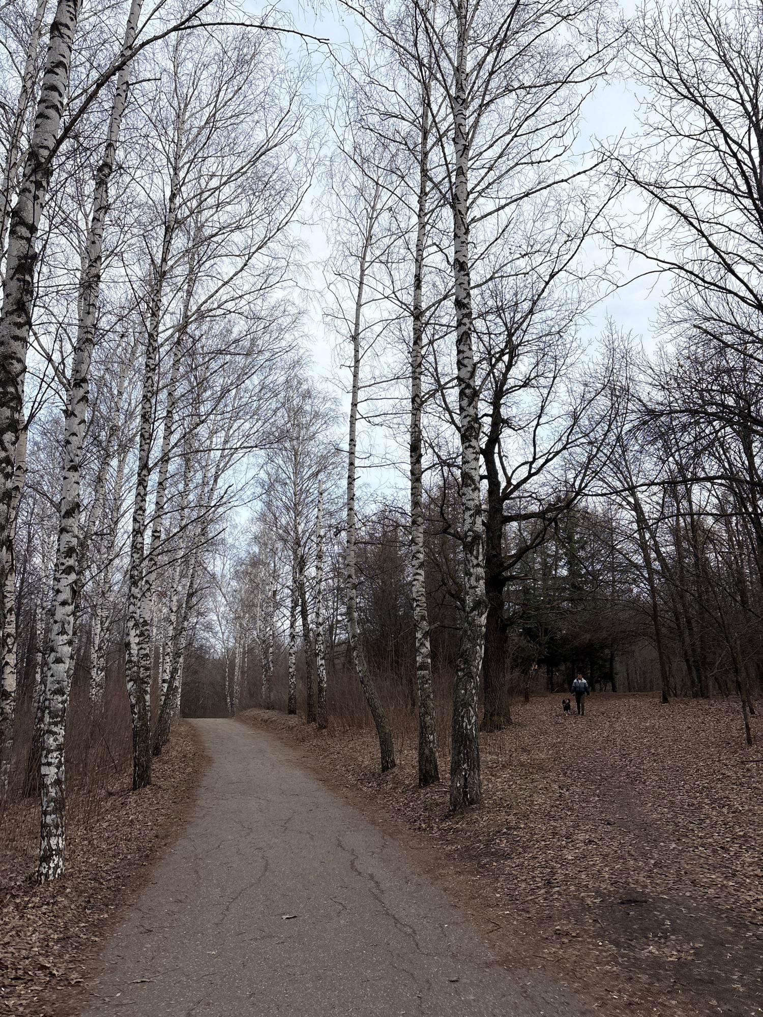 The image depicts a path in a park in Ulyanovsk, Russia. The path is lined with birch trees, their distinctive white bark contrasting with the brown of the leaves on the ground. In the background, two…read more