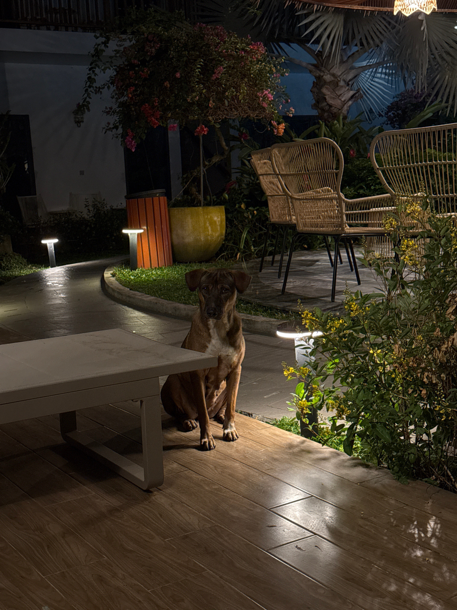 The image depicts a tranquil outdoor scene at night, likely in Phú Quốc, Vietnam. A brown, brindle-coated dog, possibly a boxer or pitbull mix, is the central subject. It lies comfortably on its side…read more