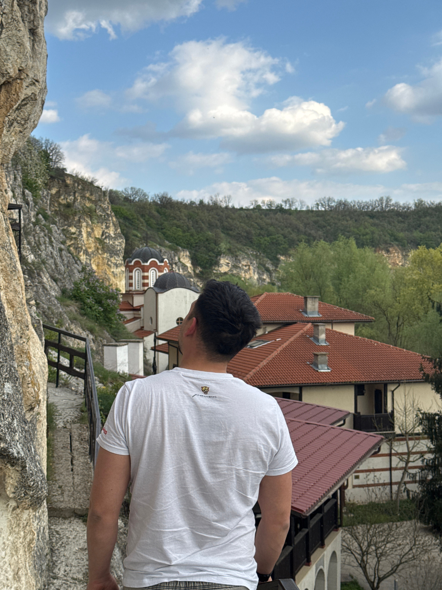 The image captures a scenic view from a high vantage point in Basarbovo, Bulgaria, looking down into a valley. The primary subject is a person, seen from behind, wearing a plain white short-sleeved t-…read more