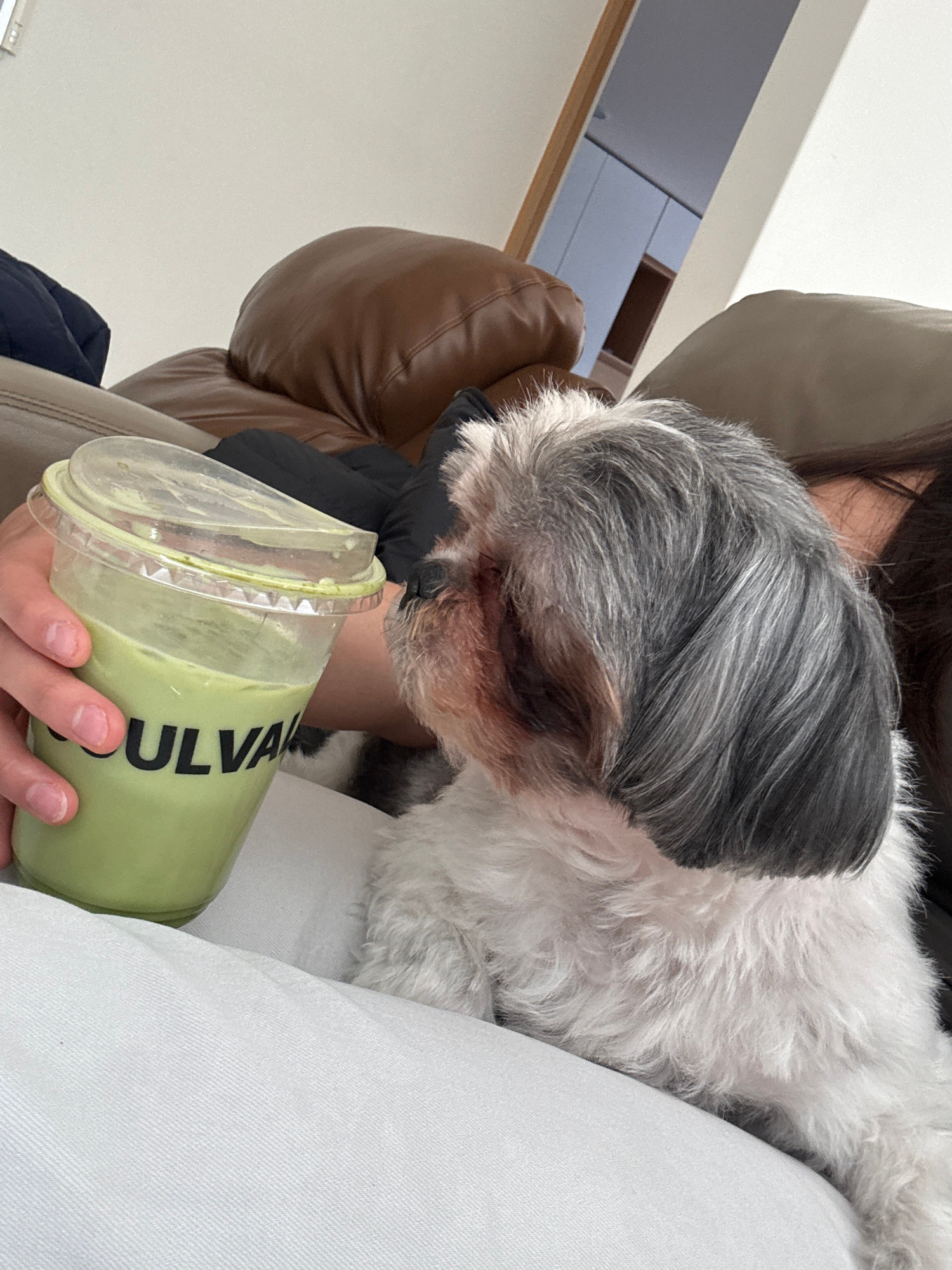 An indoor, close-up, and slightly tilted shot captures a moment of interaction between a person and a small dog. A person's hand holds a clear plastic cup containing a light green beverage, likely a s…read more