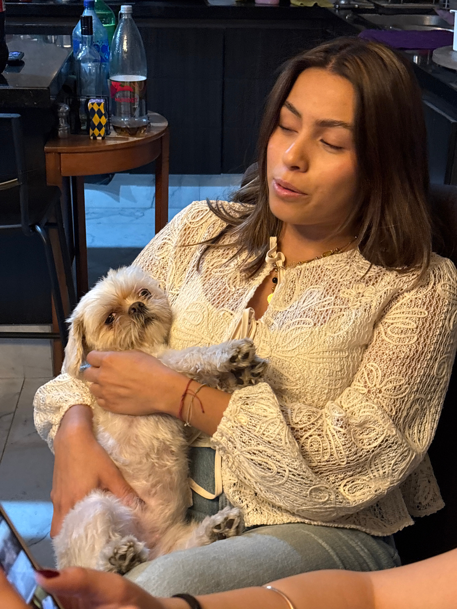 A woman with closed eyes and long brown hair is holding a small, white dog with dark patches on its paws. The woman is wearing a white, lacy top and blue jeans. She has a thin gold chain around her ne…read more