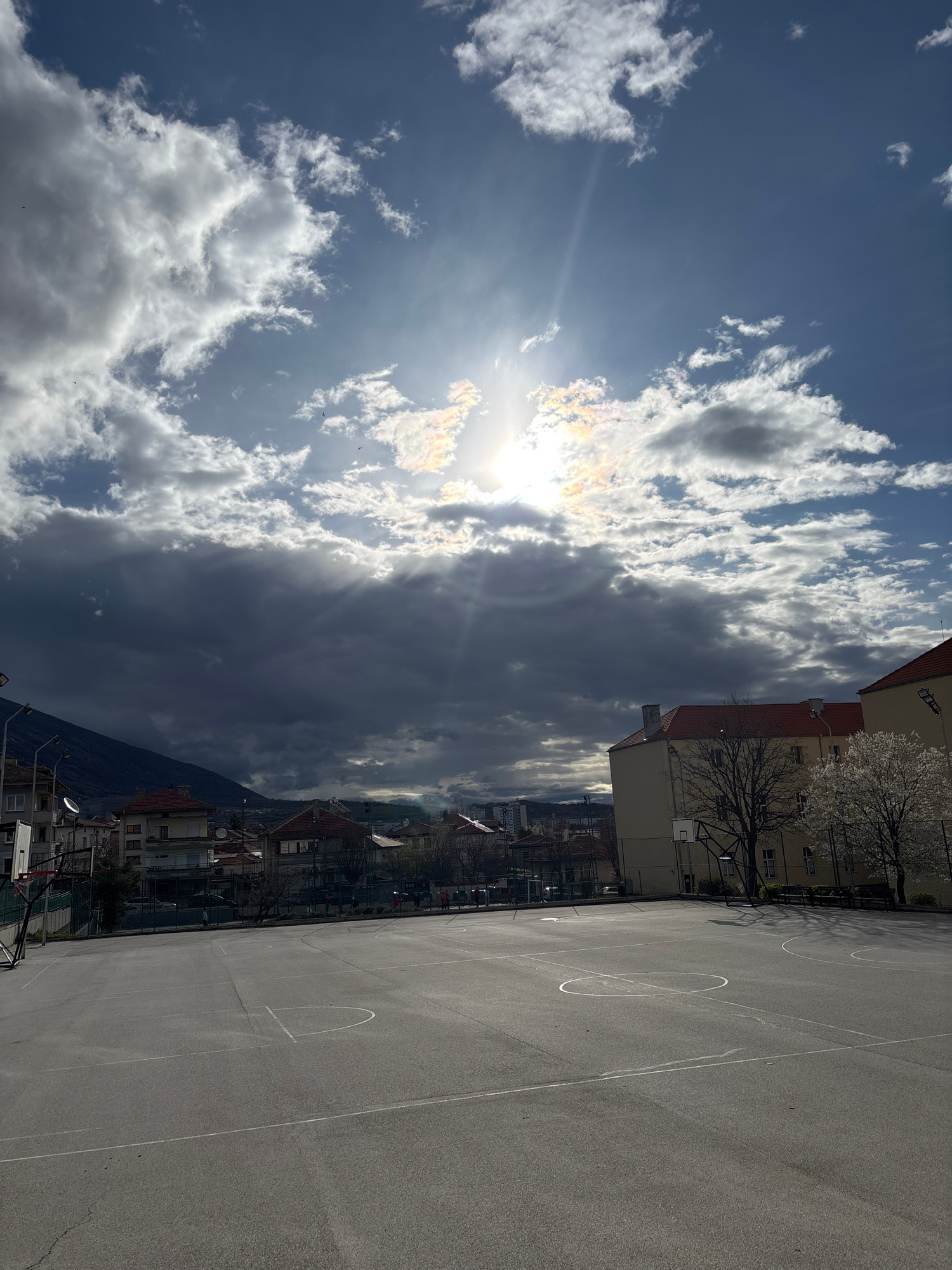 The image presents a landscape in Karlovo, Bulgaria, with a basketball court in the foreground. The court occupies the right side of the frame and has painted lines and hoops. In the middle ground, th…read more