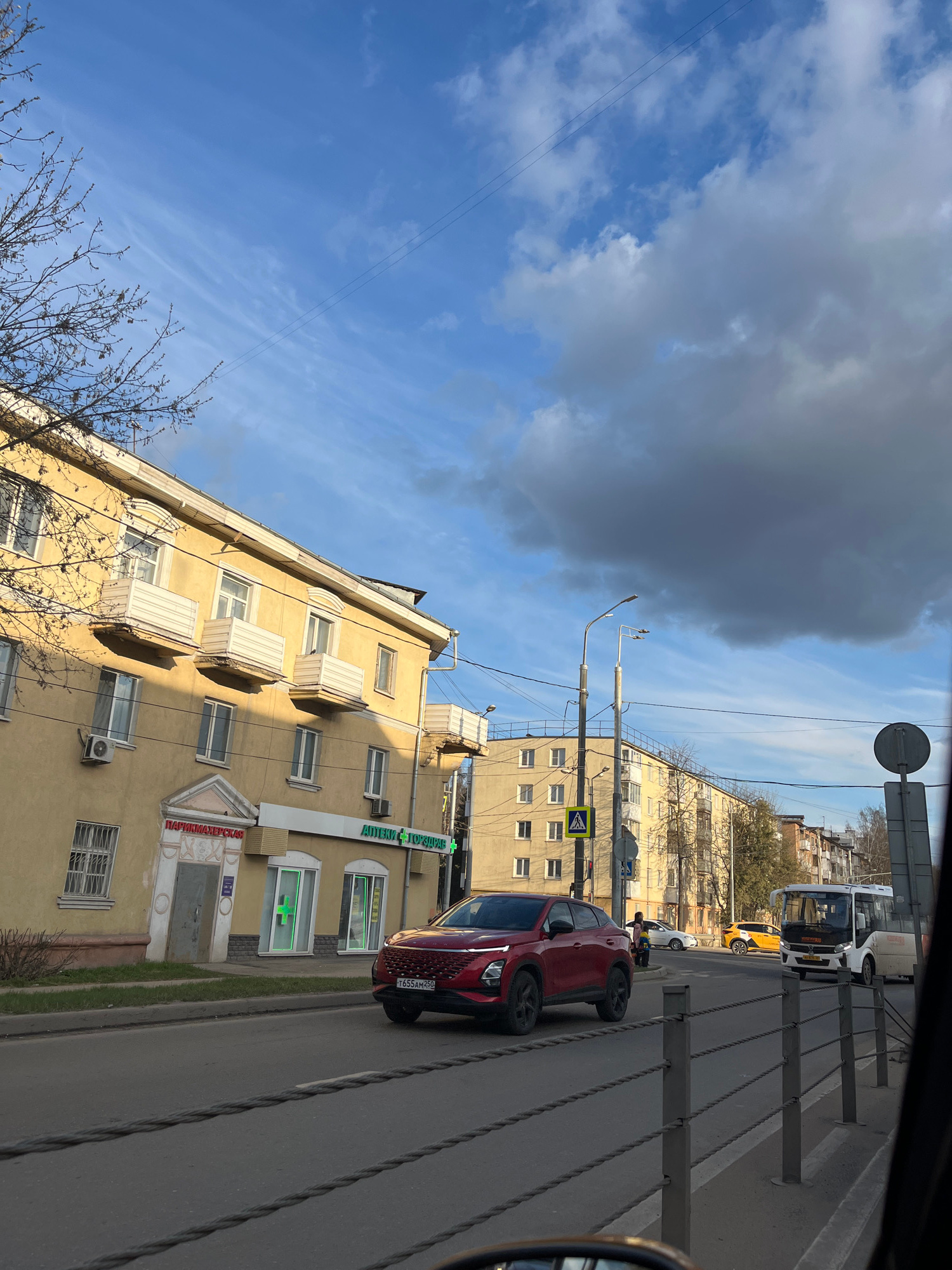 The image shows a street scene in Klin, Russia. A red car is parked along the right side of the road in front of a yellow building with a sign in Russian for a pharmacy ("АПТЕКА" in green). The buildi…read more