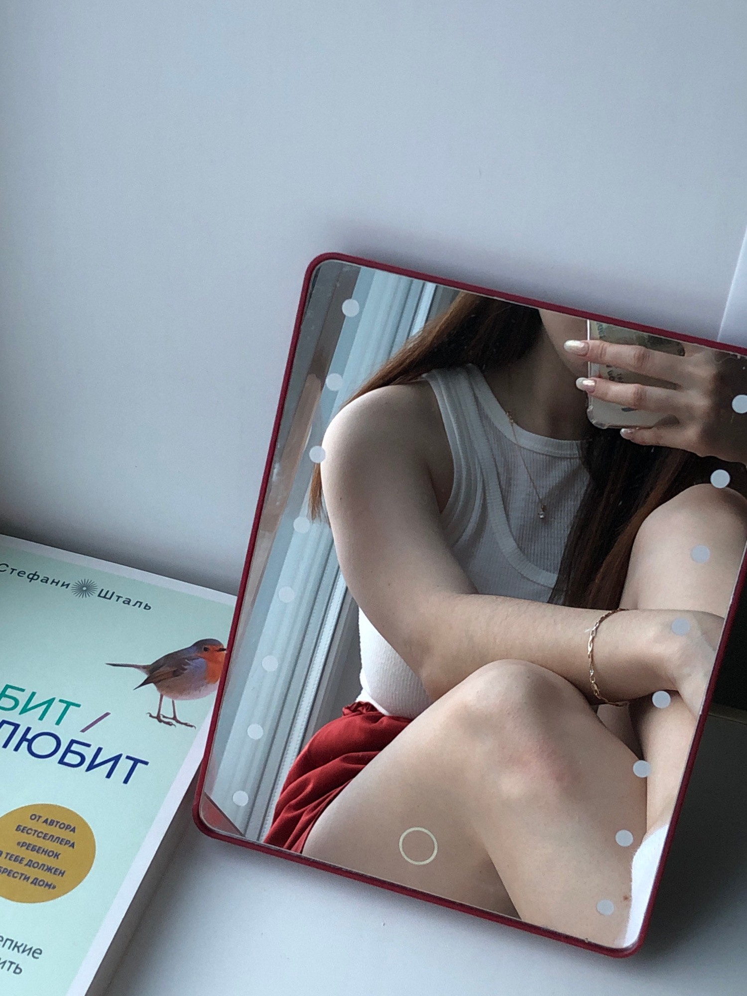 Here is a description of the image. The image shows a mirror with a red frame, reflecting a woman's body. She is wearing a white tank top and a red garment. Her hair is long and brown. Her left hand,…read more