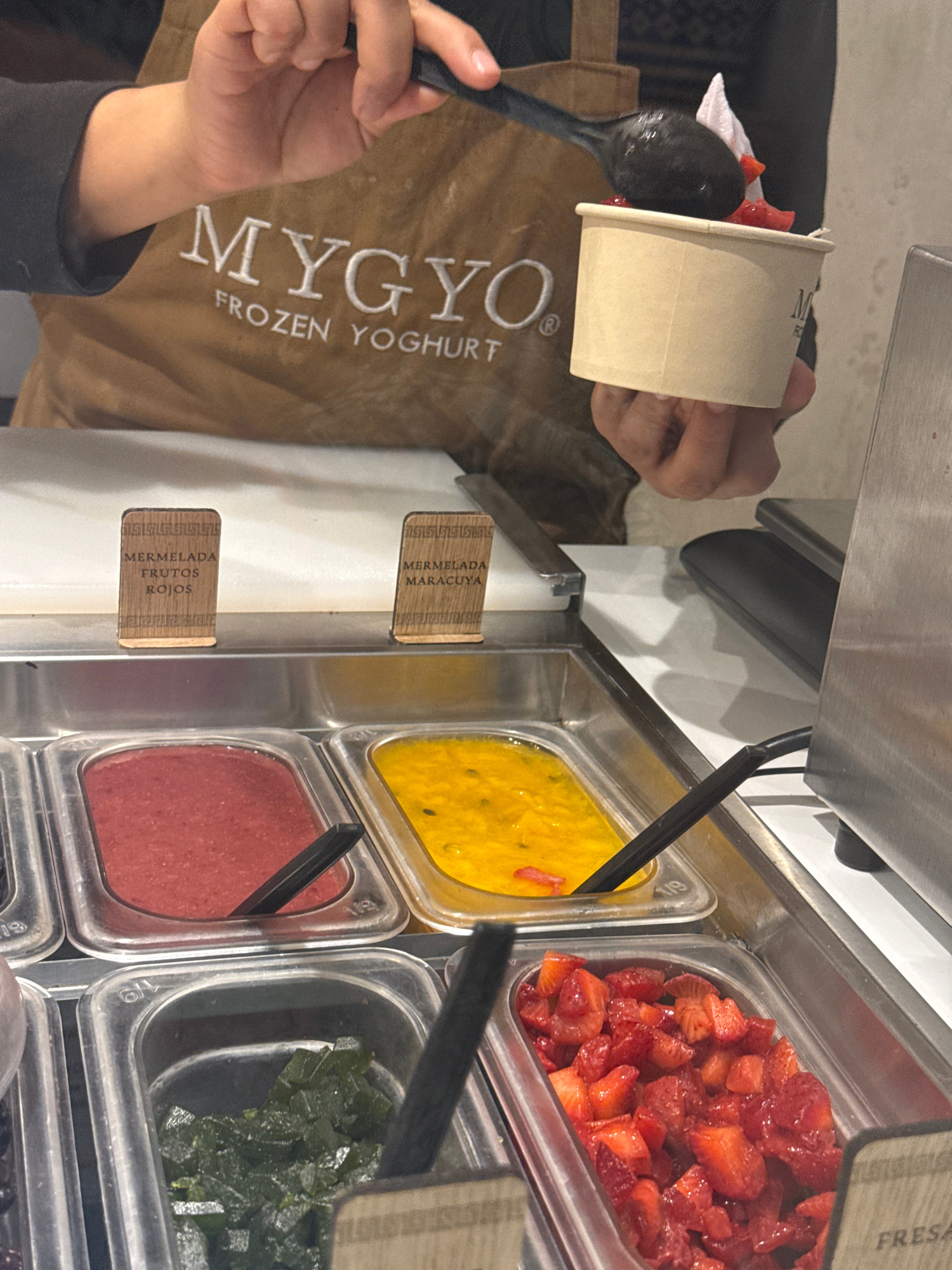A person wearing a brown "MYGYO FROZEN YOGHURT" apron is holding a brown paper cup and a black spoon with diced strawberries. The topping station contains a variety of toppings, including diced strawb…read more