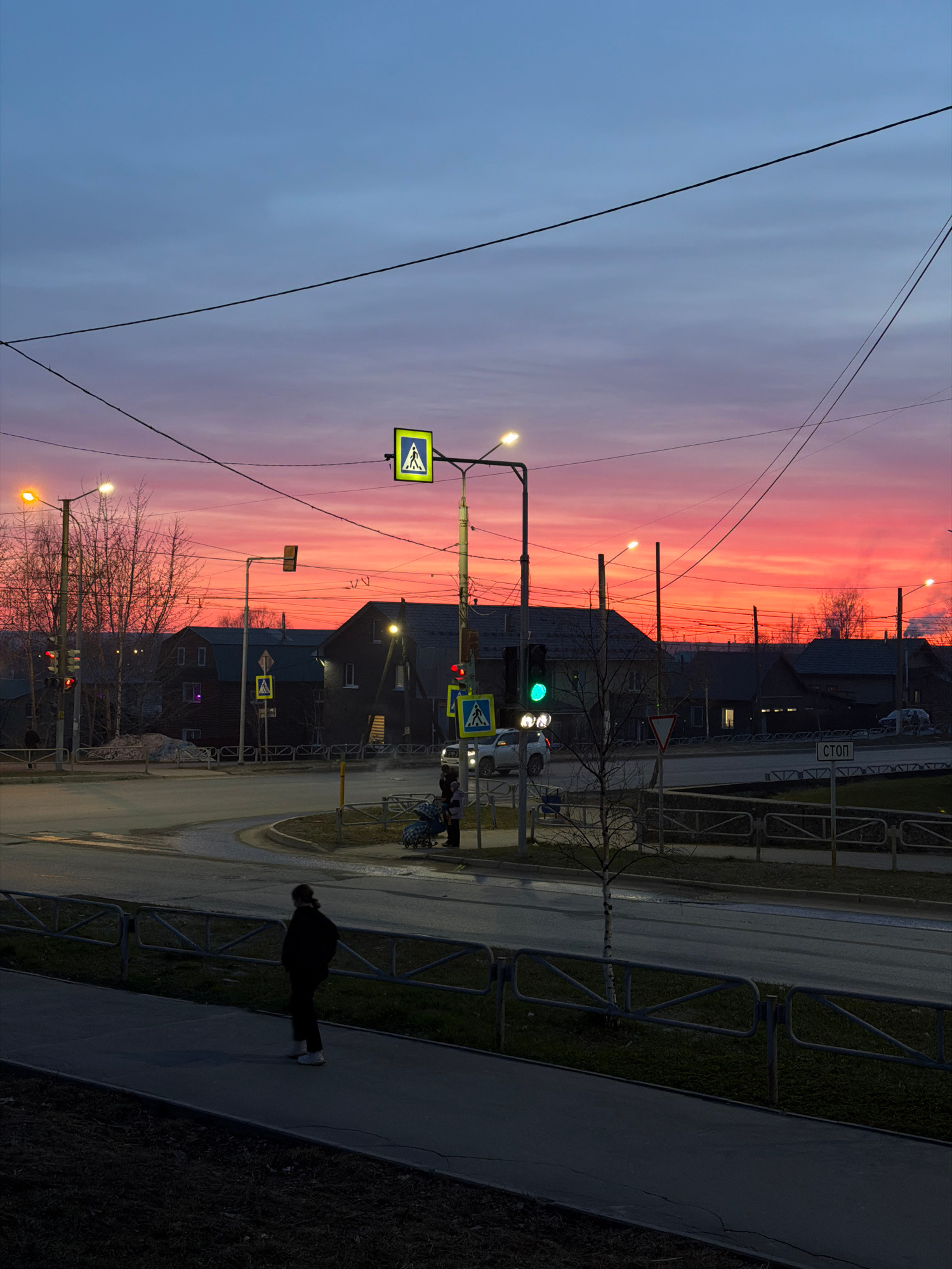 This image captures an urban street scene at twilight, likely sunset, characterized by a strikingly colorful sky. The horizon glows with intense reds and oranges, transitioning upwards through shades…read more