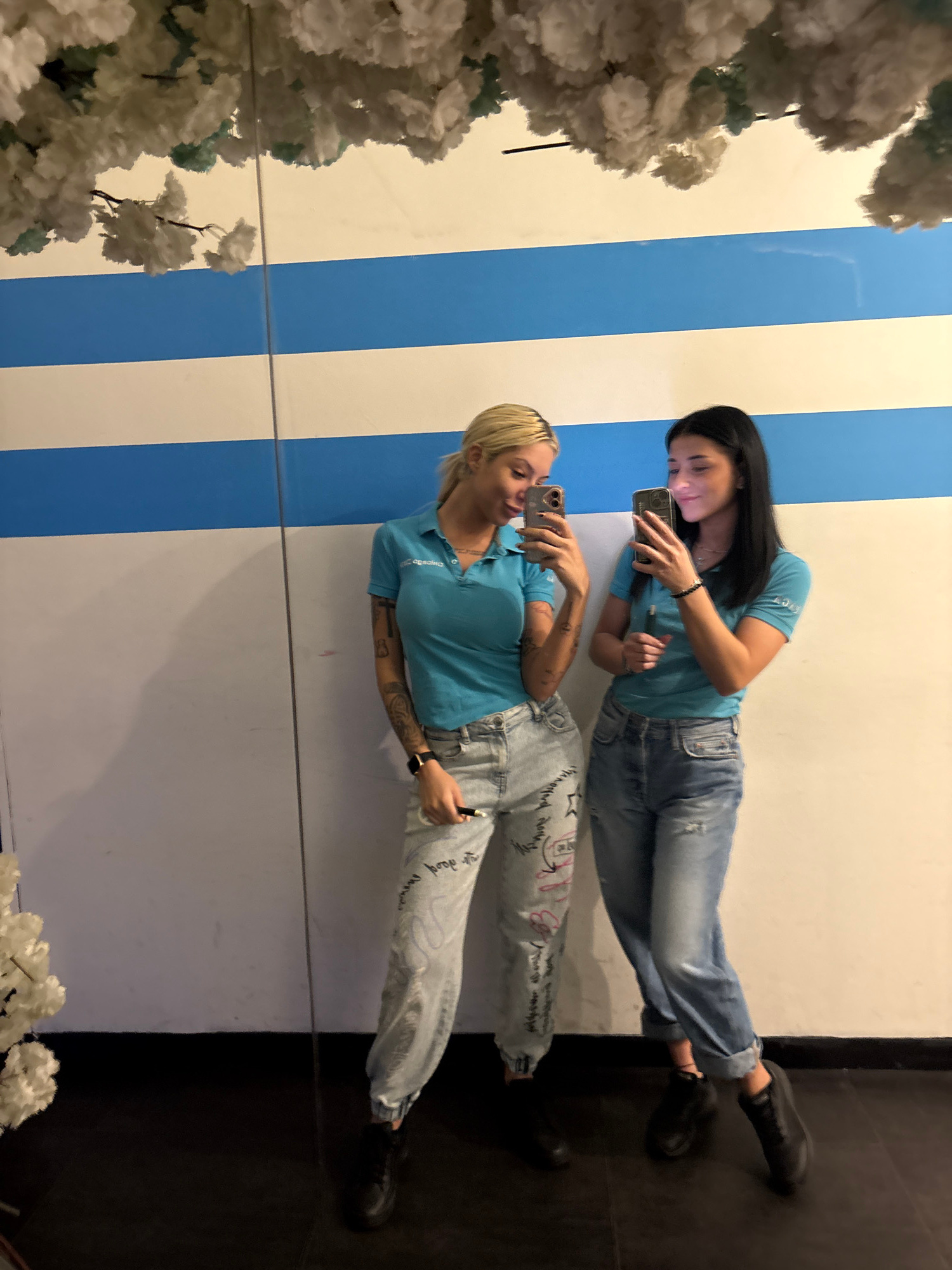 Two women stand in front of a mirror, each holding a smartphone. The woman to the left has blonde hair and is wearing a light blue t-shirt, patterned jeans, and black shoes. The woman to the right has…read more