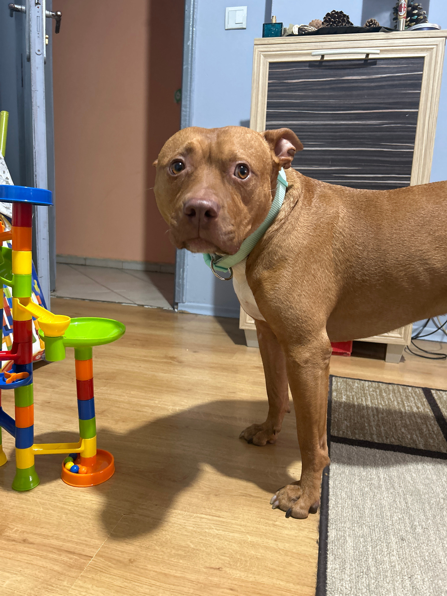 A medium shot of a brown, short-haired dog standing on a wooden floor in a room. The dog is wearing a light green collar and looking directly at the camera. In the foreground is a colorful toy marble…read more