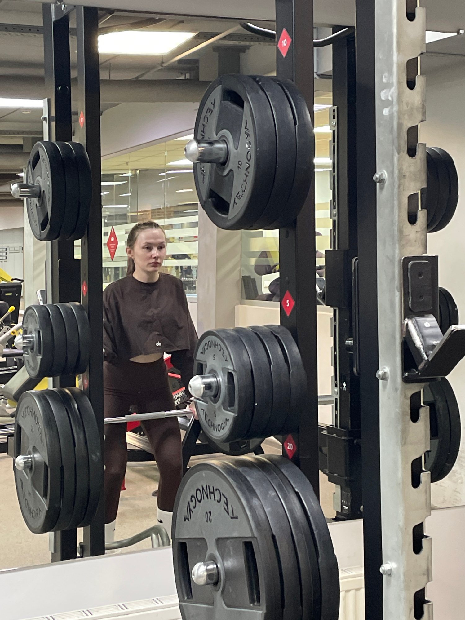 The image depicts an indoor gym setting, likely in Izhevsk, Russia. Dominating the foreground is a weight rack with black weight plates stacked on multiple levels. Each plate is marked with the brand…read more
