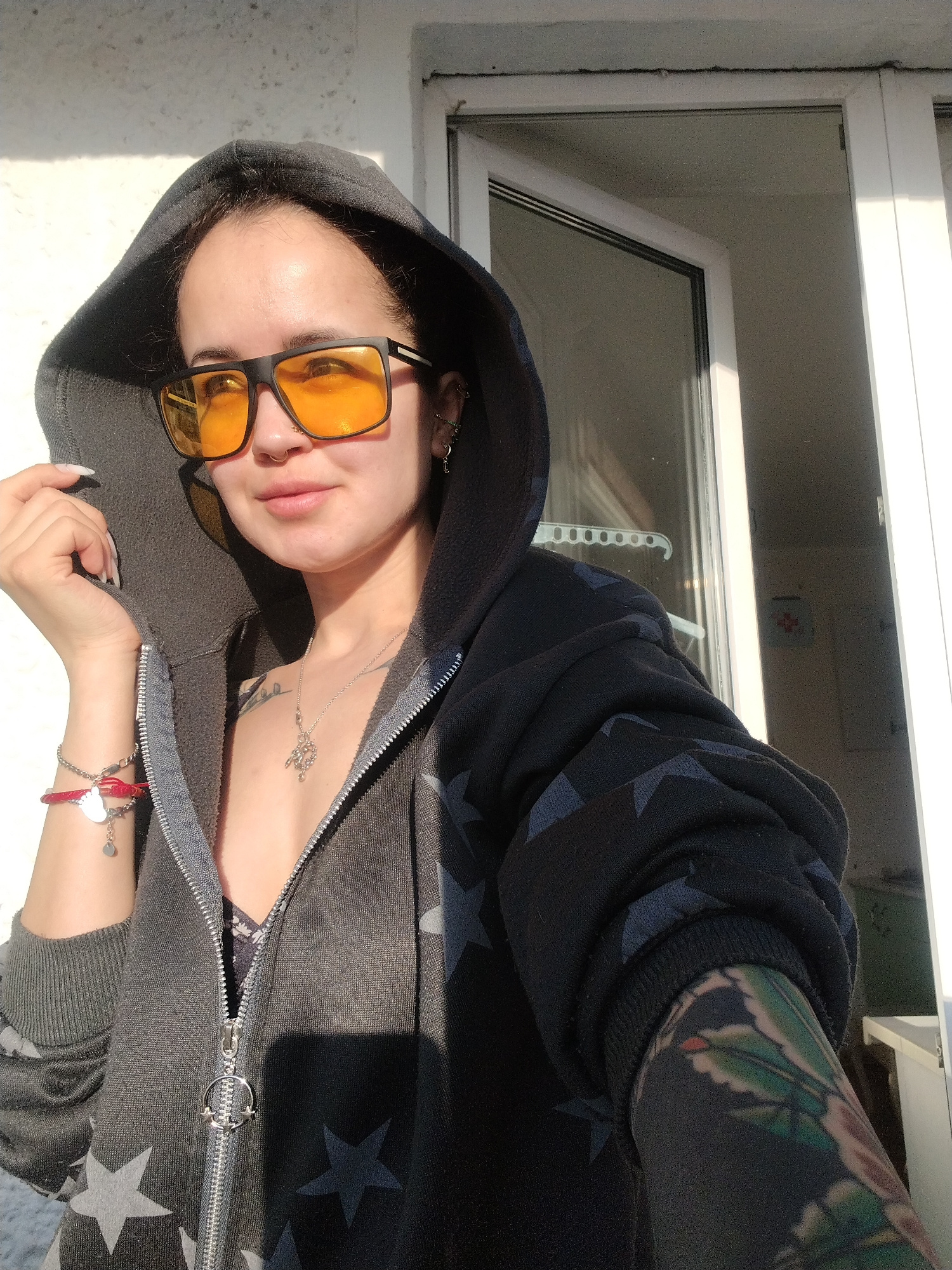 A young woman with tattoos is posing for a selfie in front of an open window or door. She is wearing a hooded jacket, zipped partially open, and orange-tinted sunglasses. She has a necklace and a bracβ¦read more