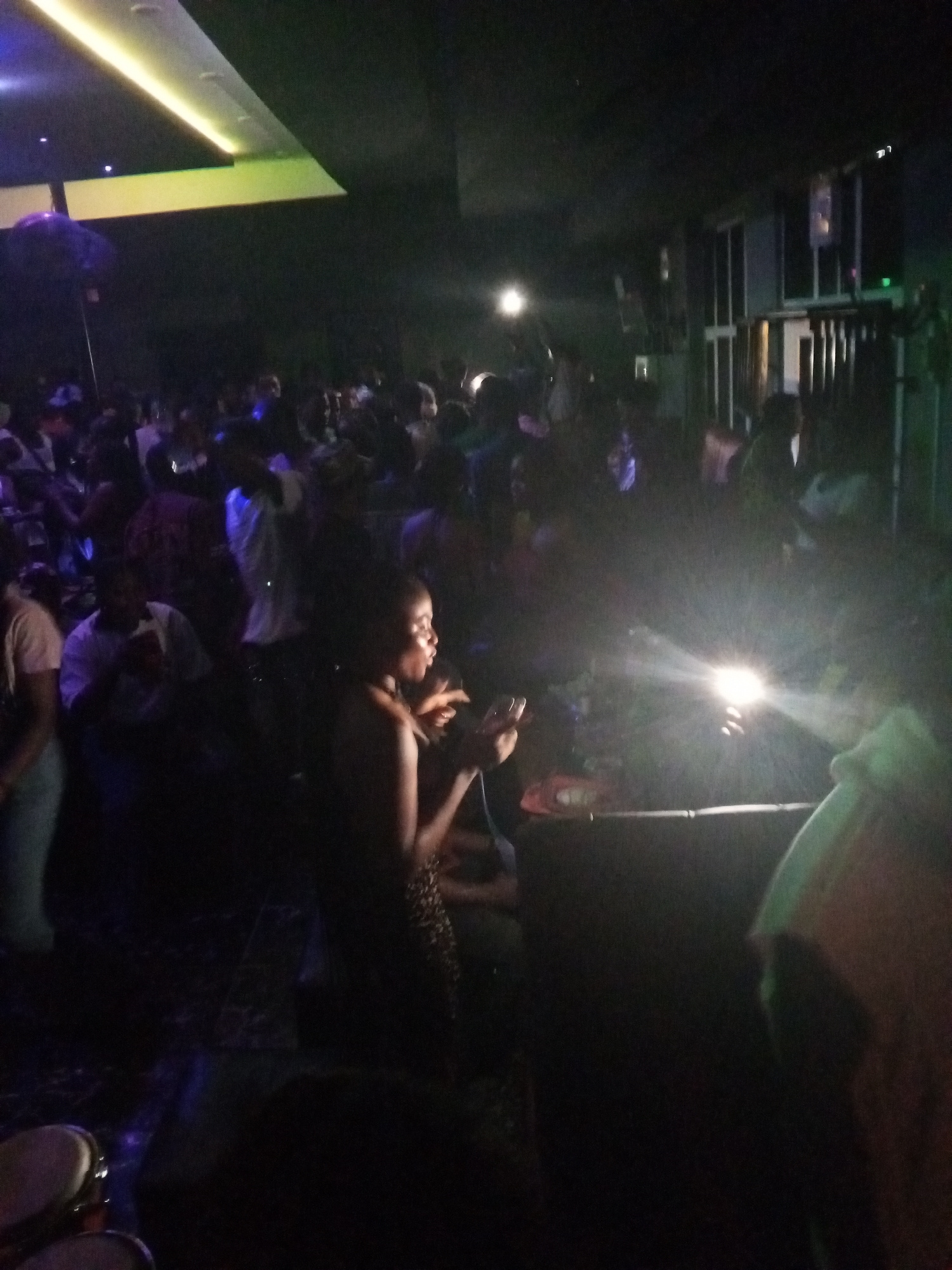 A dimly lit indoor scene depicts a crowded space, possibly a nightclub or a gathering in Lokoja, Nigeria. Numerous individuals are present, with one woman in the foreground appearing to be speaking or…read more