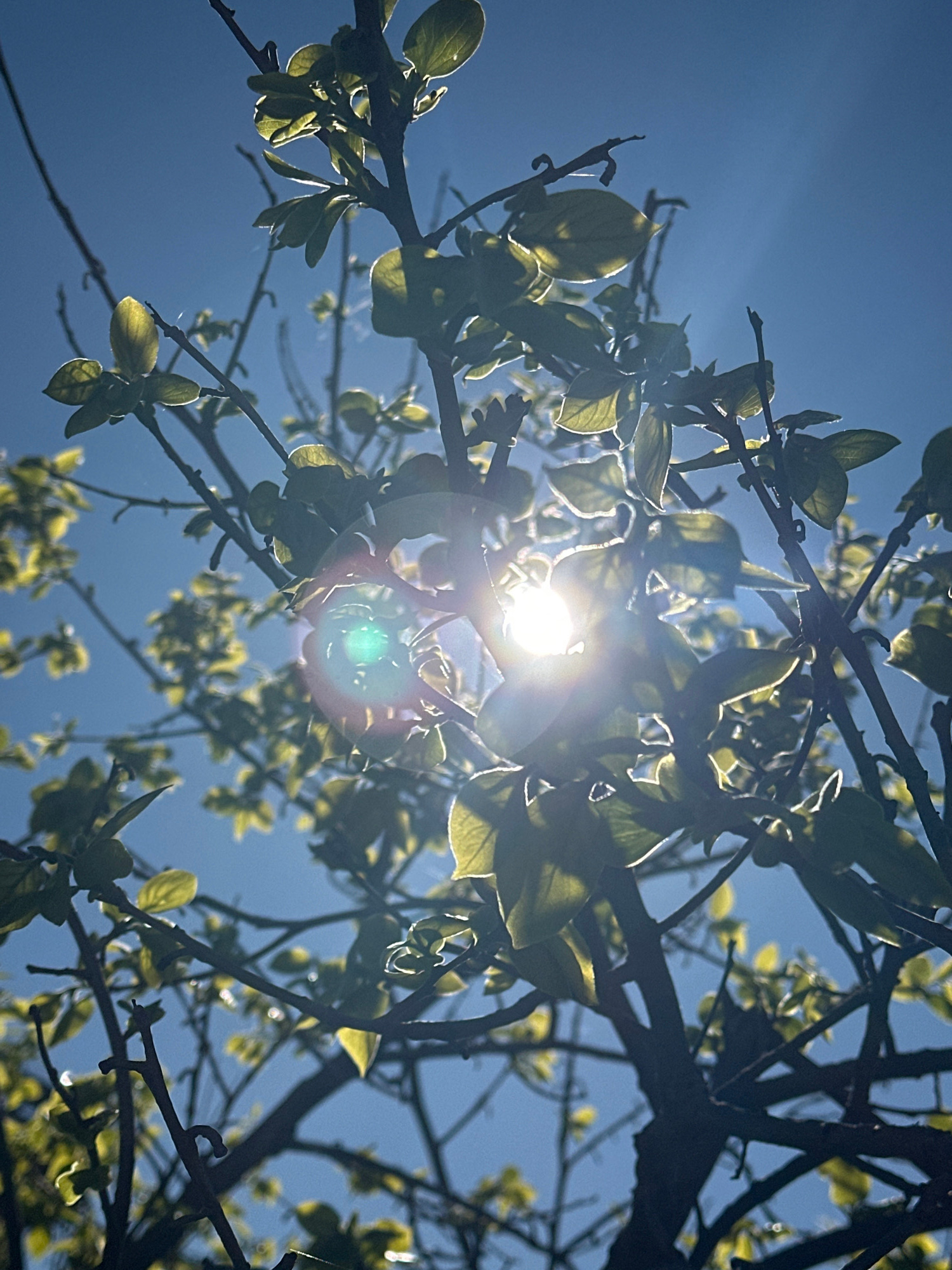 The image depicts a low-angle view looking up through tree branches and leaves towards the sun. The leaves are small and green, suggesting new growth. The branches are dark and silhouetted against the…read more