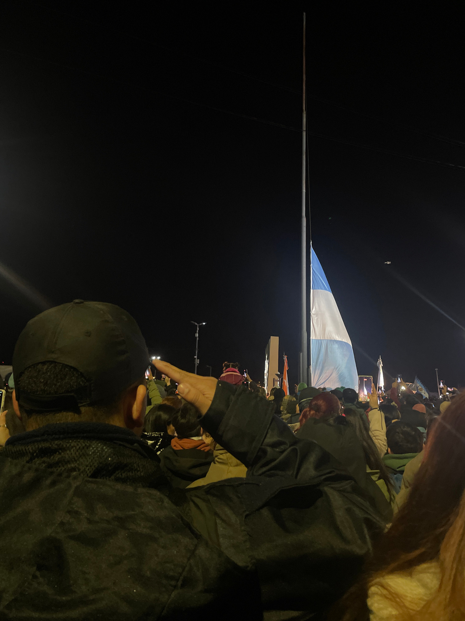 The image shows a crowd of people at night, some holding phones up to record. There is a large blue and white flag stretched horizontally above the crowd. The background is dark, with visible wires an…read more