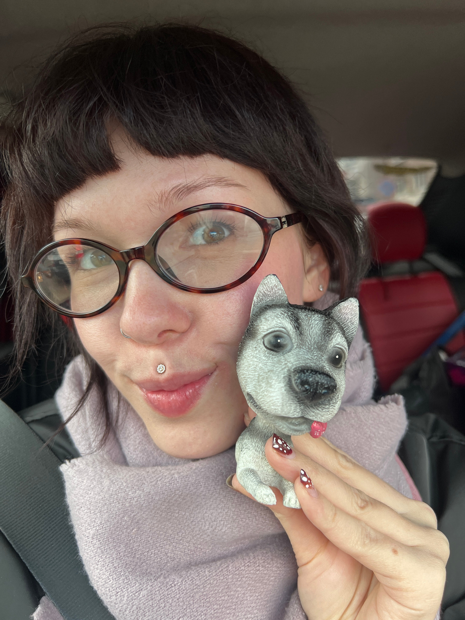 A fair-skinned woman with dark hair and round glasses is holding a small dog figurine. She has a piercing on her nose and a piercing in her ear. Her fingernails are painted with a red and white polka…read more
