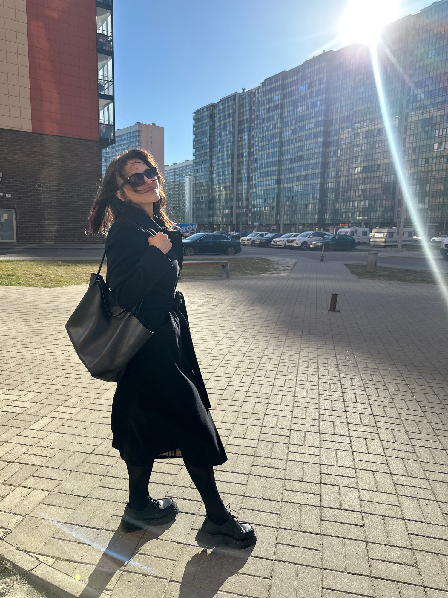 The image captures a woman standing on a paved sidewalk in a modern urban setting under bright sunlight. The woman, positioned slightly to the right of the frame, has dark hair and wears sunglasses, a…read more