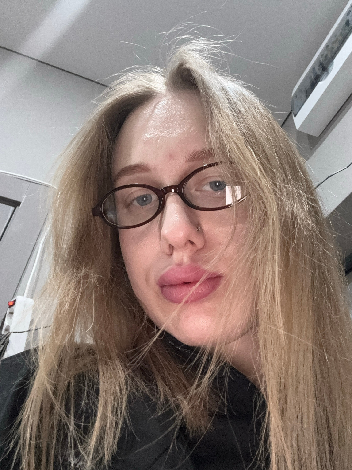 A selfie of a blonde woman wearing glasses. She is facing the camera at an unusual angle with her head tilted. Her lips are pursed. The background is an indoor setting that appears to be a workspace o…read more