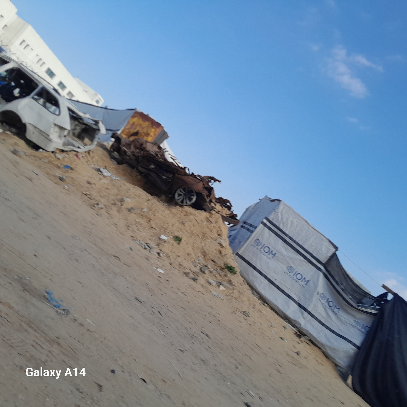 The image depicts a scene of severe destruction and debris in Khan Yunis, Palestinian Territory, under a clear blue sky with scattered clouds. The ground consists of light brown sand and dirt, forming…read more