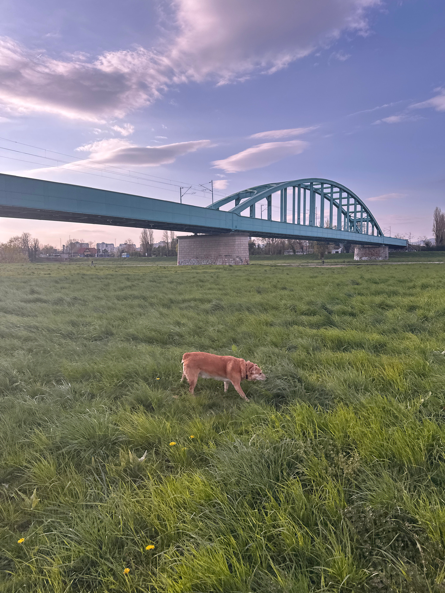 A dog stands in a field of grass with the Željeznički most ("Railway Bridge") in Zagreb, Croatia, visible in the background. The sky is light blue with clouds. The dog is light brown with a grey muzzl…read more