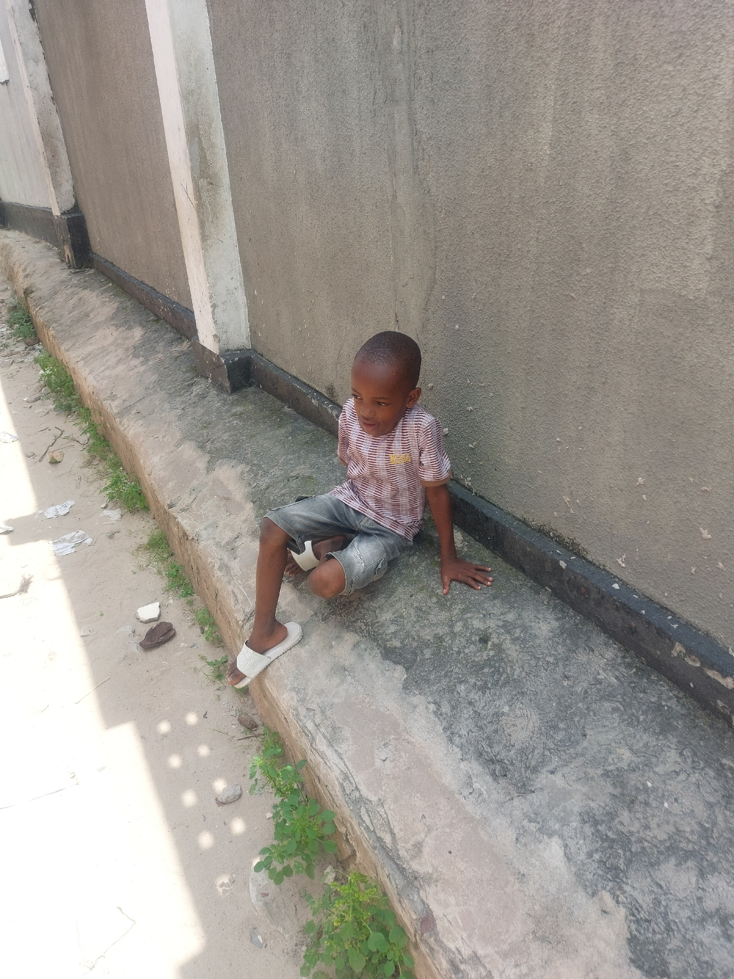 A young boy in a striped shirt, denim shorts, and white sandals is on a concrete structure that appears to be the exterior of a building. He has one hand on the concrete. There is sand and some vegeta…read more