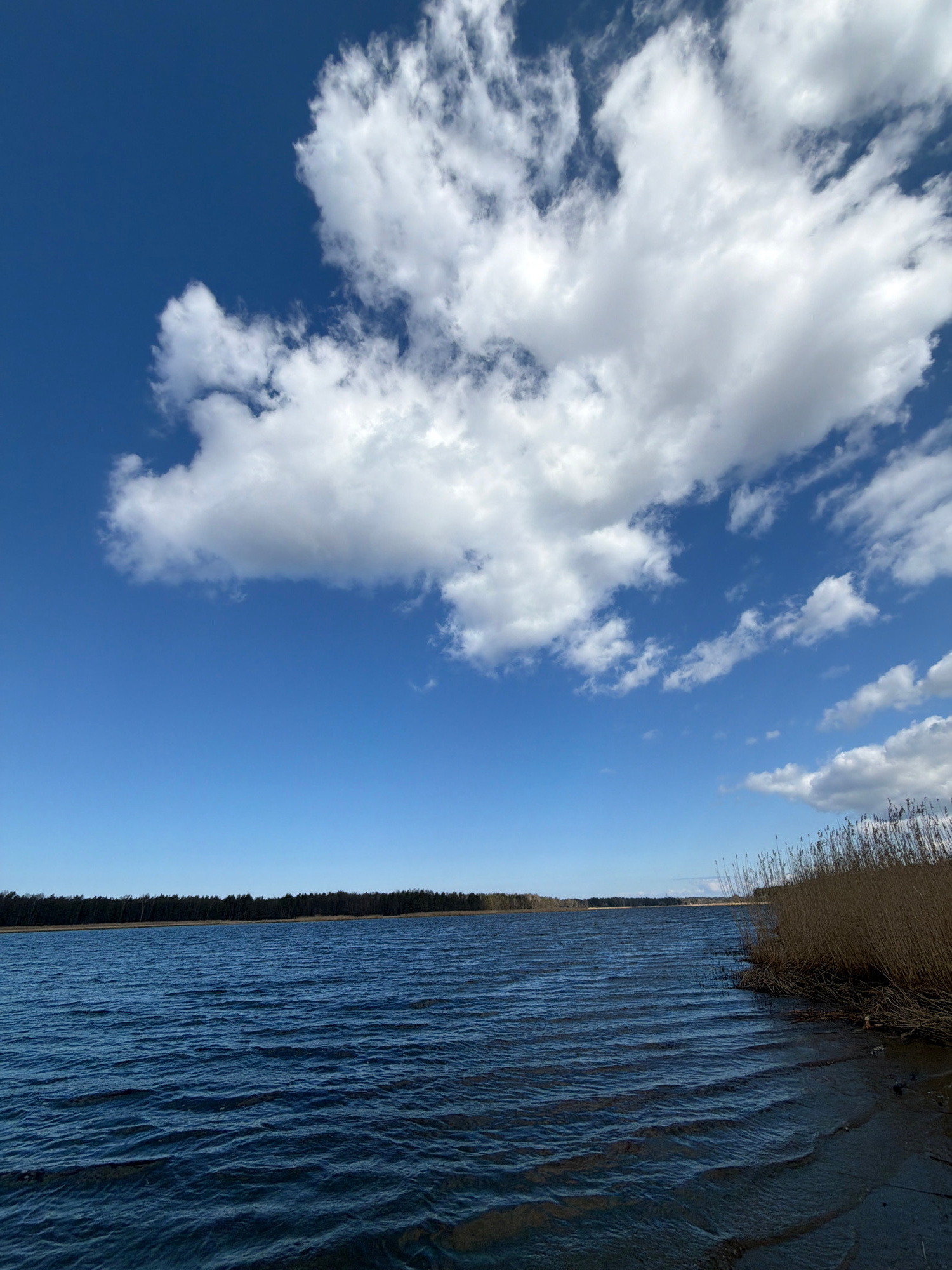 The image shows a body of water with a blue sky and white clouds. The water has small ripples on the surface and the shoreline is lined with reeds and trees. The location is likely a lake or river in…read more