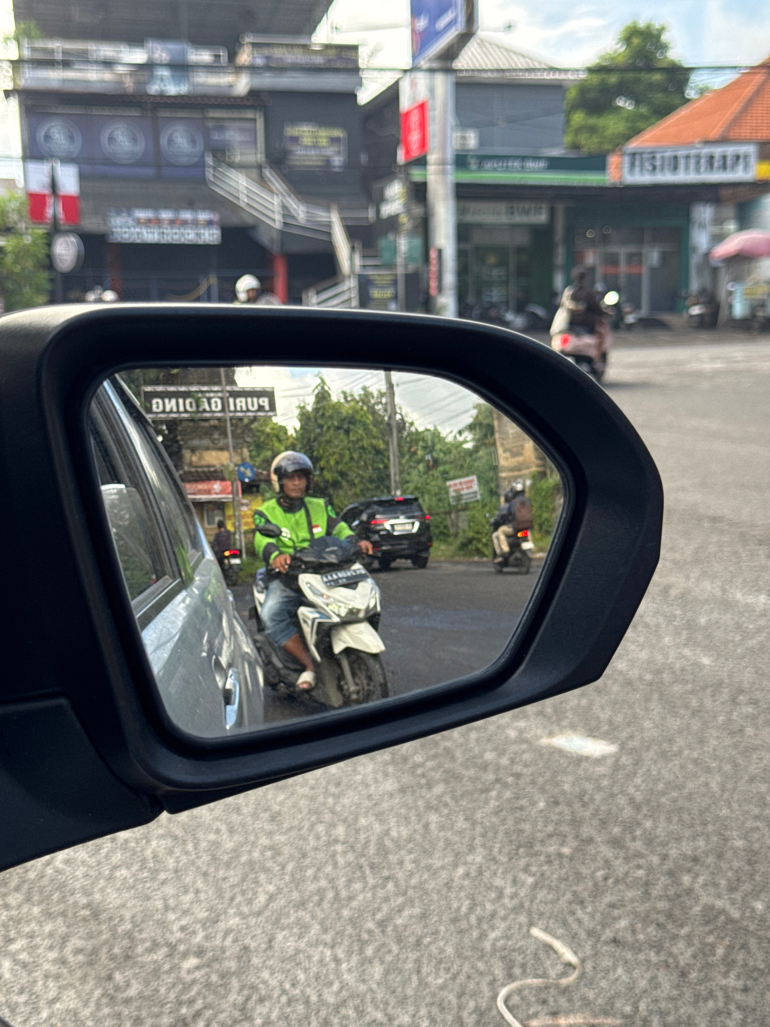 The image is a view from a car side mirror in Kuta Selatan, Indonesia. The mirror shows a motorcyclist in a green jacket and helmet on a white motorbike, driving on the road behind the car. A black ve…read more