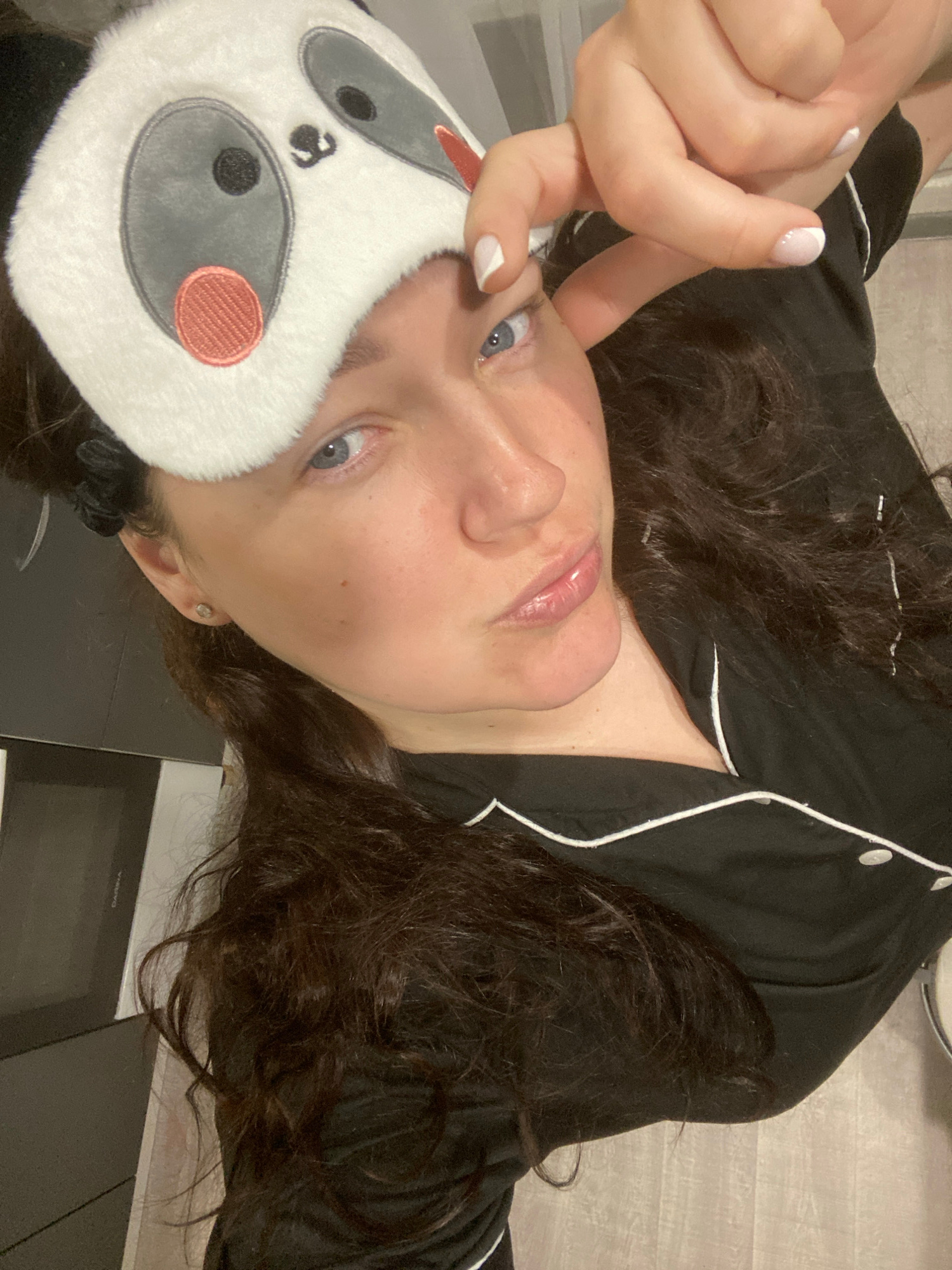 A young woman lies on a surface, possibly a bed or countertop, wearing black pajamas with white piping and a white plush eye mask shaped like a panda bear. Her dark, curly hair is spread around her heβ¦read more