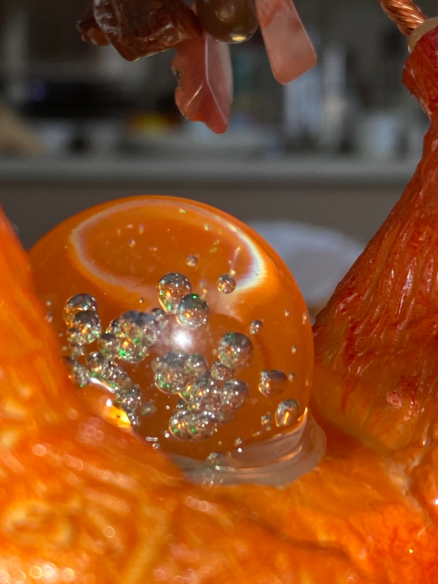 An extreme close-up shot features a vibrant, translucent orange object, likely made of resin or glass, occupying the central and right portions of the frame. Within this smooth, glossy object are nume…read more