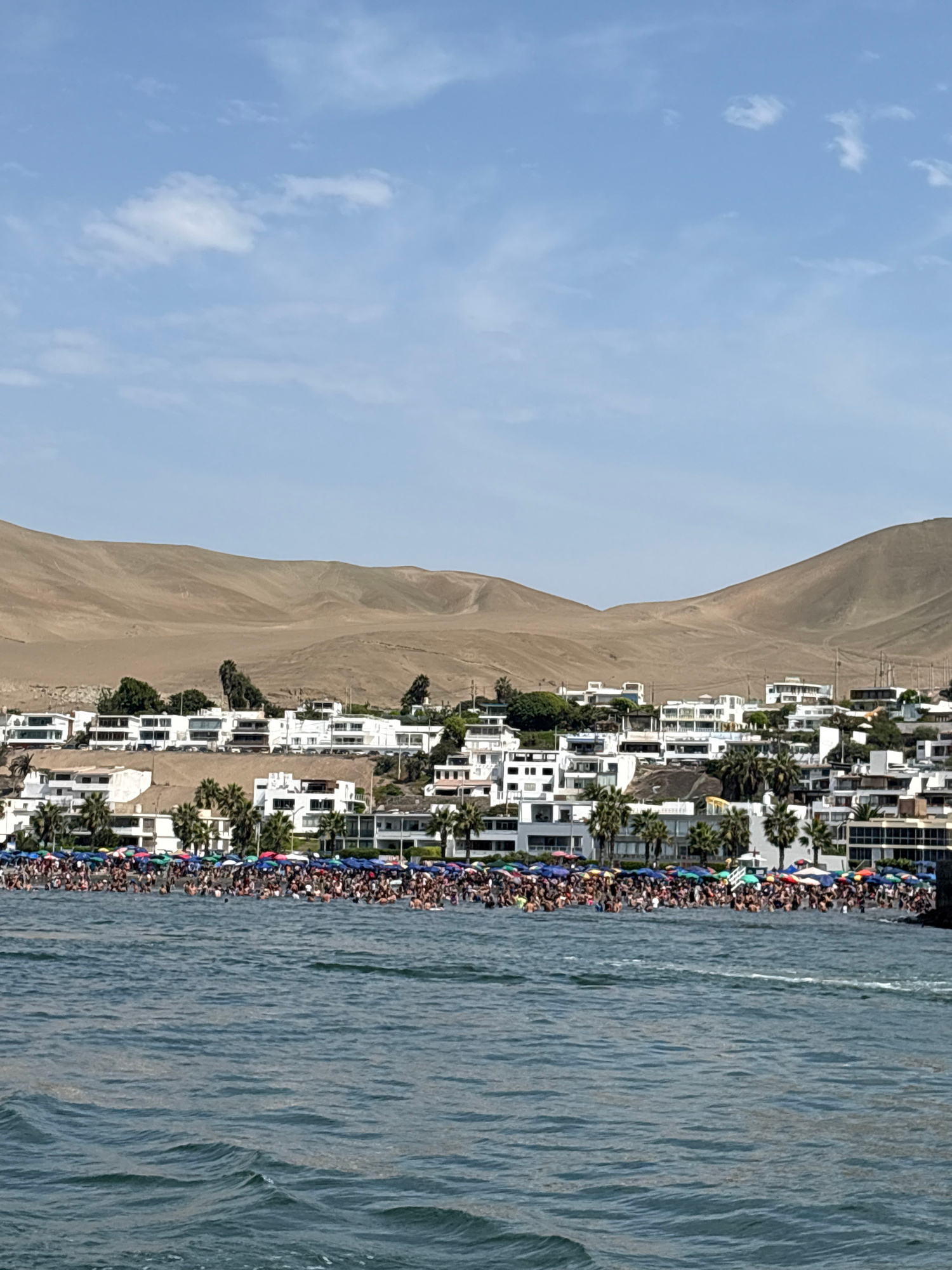 The image depicts a crowded beach in Ancón, Peru, on a sunny day. A large sand dune borders the beach on one side. White buildings and palm trees line the coast between the dune and the beach. A large…read more