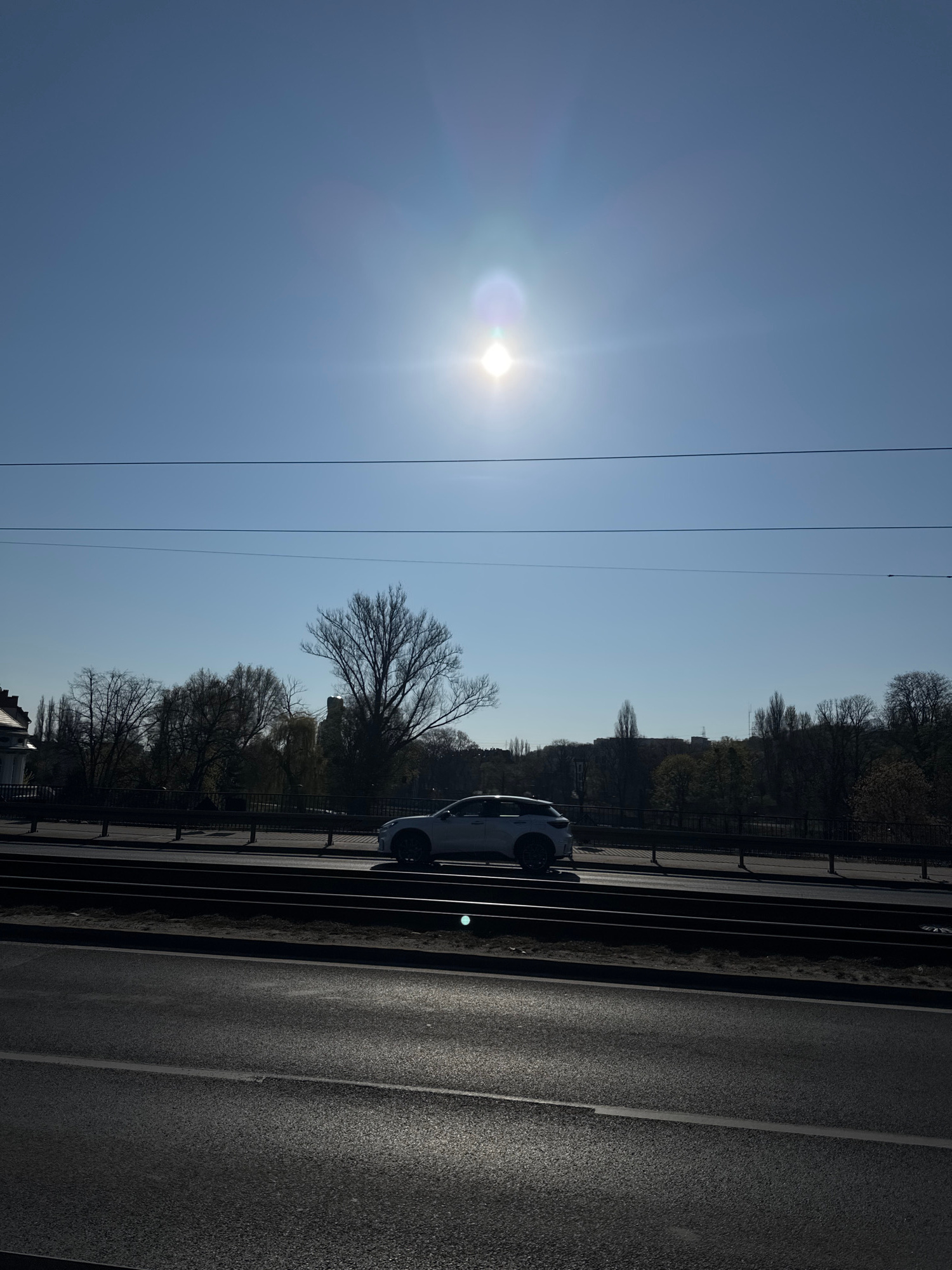 The image, taken on a bright and clear day, displays an outdoor scene from a slightly elevated vantage point. A prominent, intensely bright sun with lens flare is visible in the upper-left portion of…read more