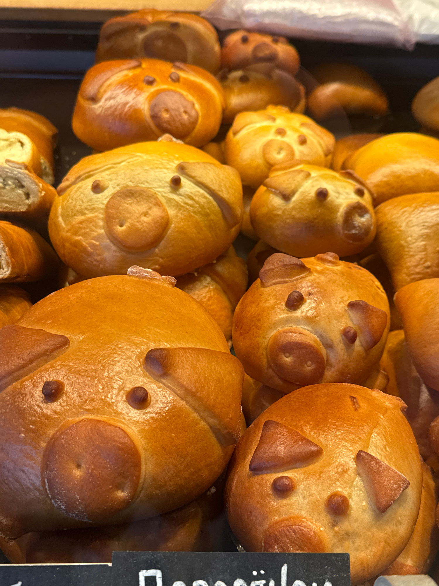 The image shows a close-up view of a display of pig-shaped buns or pastries. The buns are golden-brown and have distinct features such as round snouts, triangular ears, and small eyes, creating a pig-…read more