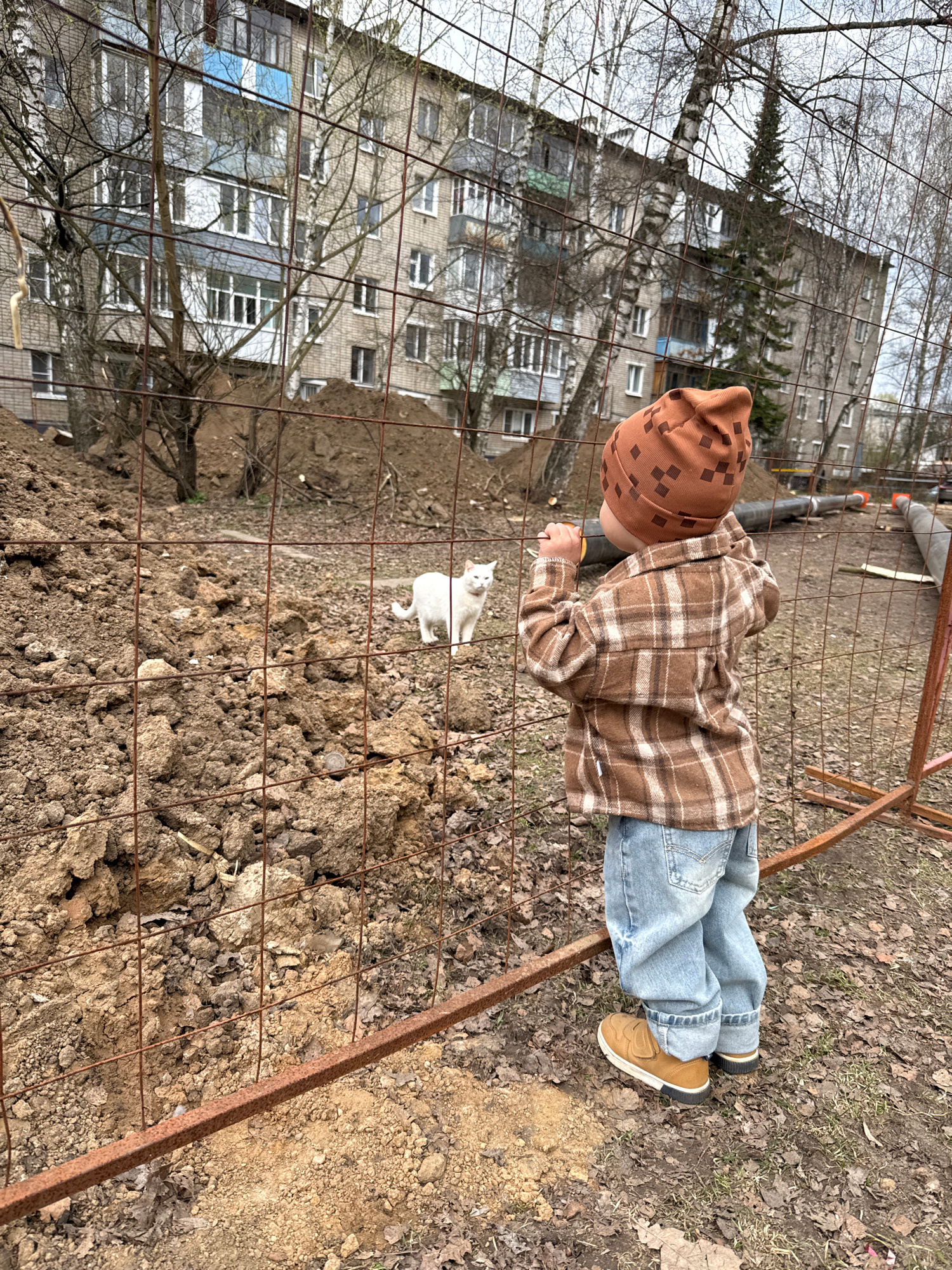 An overhead view captures a young child standing in an outdoor setting in Rusanovo, Russia, observed through a rusty metal grid fence in the foreground. The child is dressed in a brown patterned beaniβ¦read more