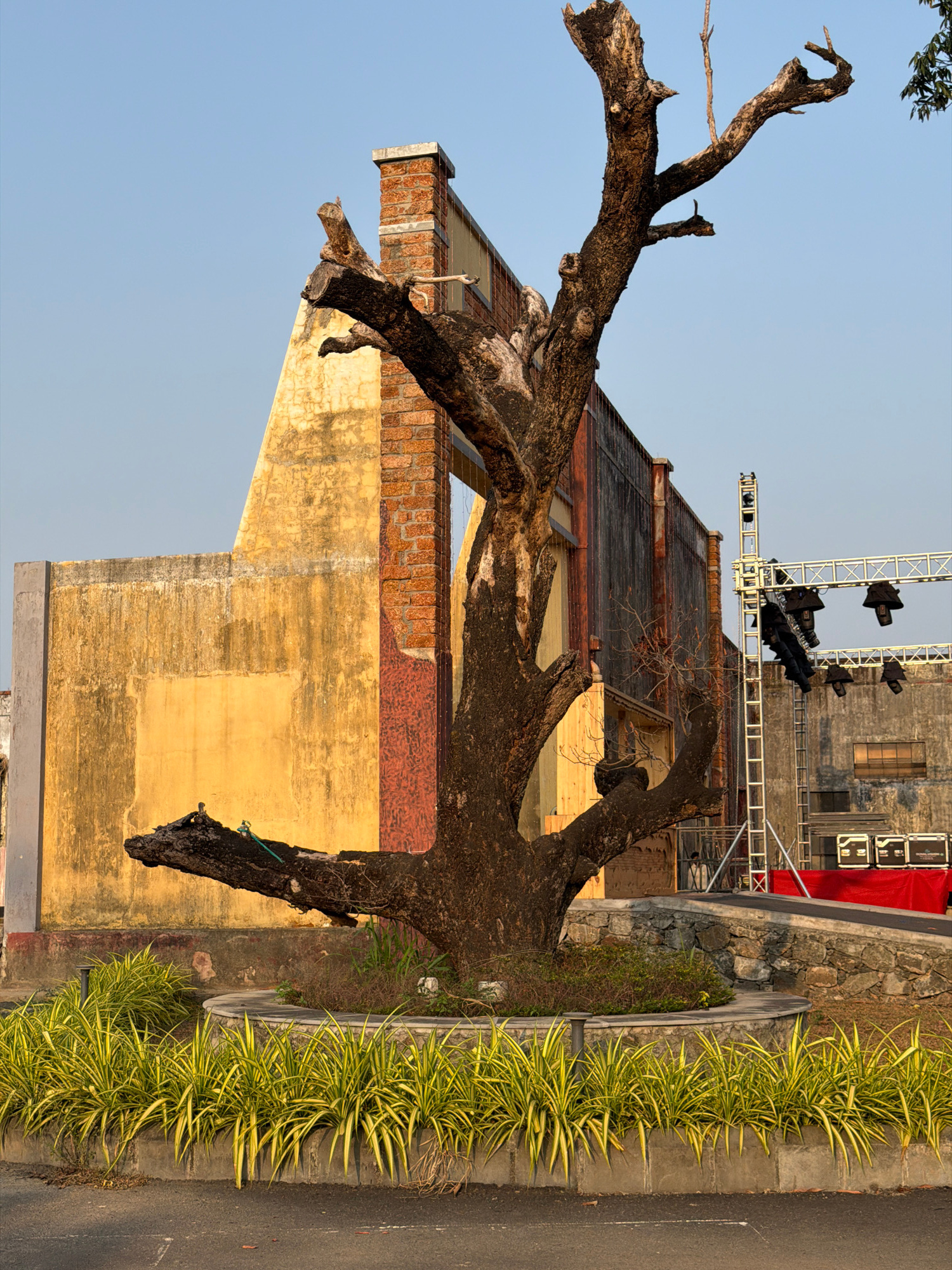 The image depicts a dead tree with large branches against the backdrop of a building in Kalamassery, India. The building has a weathered exterior, with exposed brick and yellow painted surfaces. A sca…read more