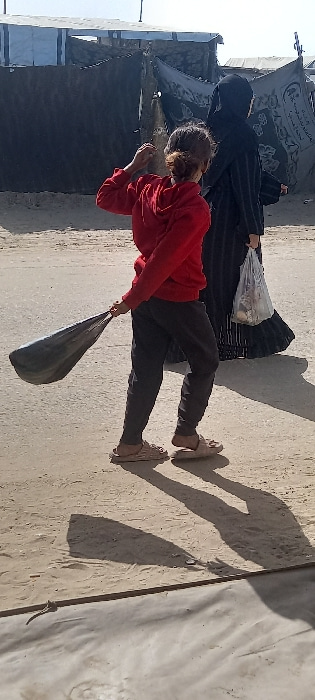 The image captures an outdoor scene in Khan Yunis, Palestinian Territory, under daylight conditions. Two individuals are depicted from behind, walking towards the right side of the frame. In the foreg…read more