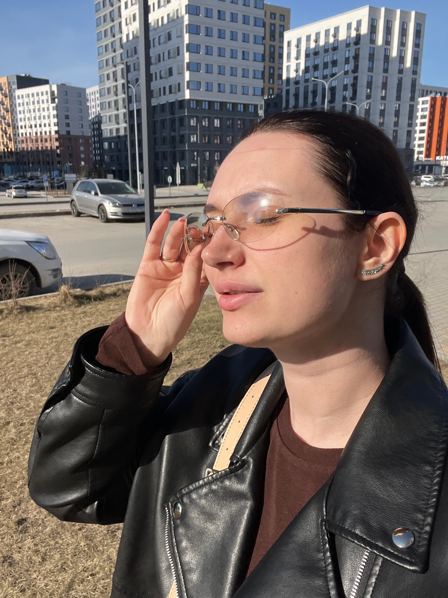 A woman with dark hair pulled back, wearing clear-framed glasses and a black leather jacket over a brown shirt, is adjusting her glasses. She is standing outdoors, likely in Tyumen, Russia, as evidenc…read more