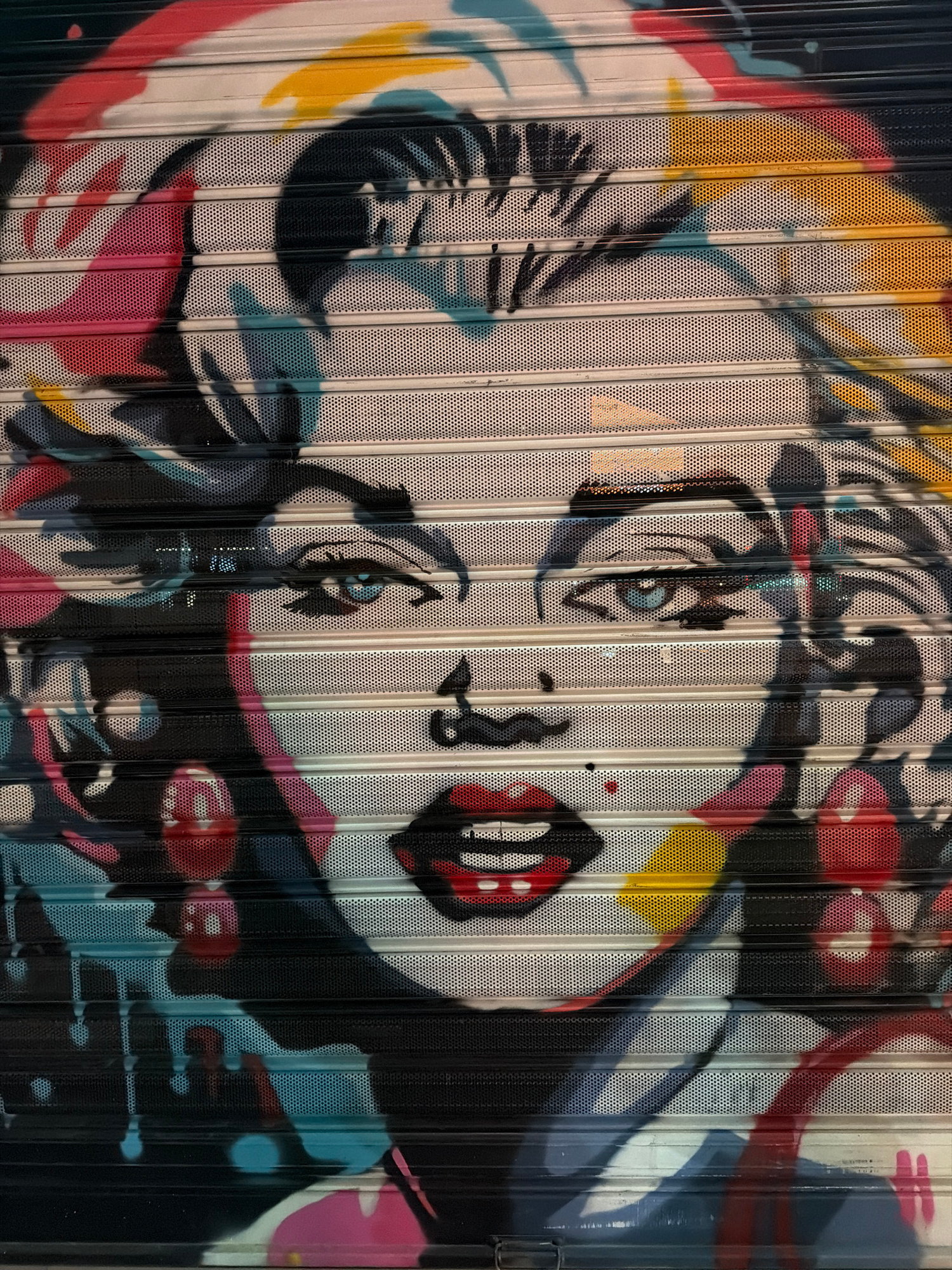 The image captures a mural painted on a perforated metal shutter. The mural depicts a stylized face of a woman, rendered with vivid colors like red, yellow, pink, and blue, as well as black and white.…read more