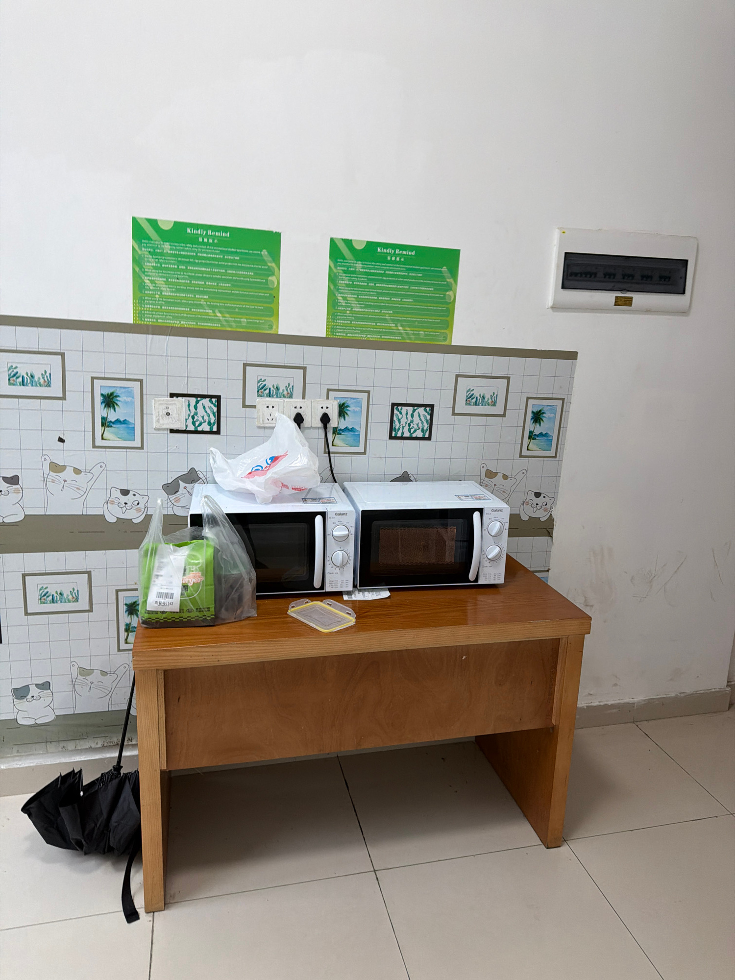 A stacked microwave setup sits on a wooden shelf against a wall with a patterned wallpaper in what appears to be an indoor location. The wallpaper features a grid design, with cat and nature themed pi…read more