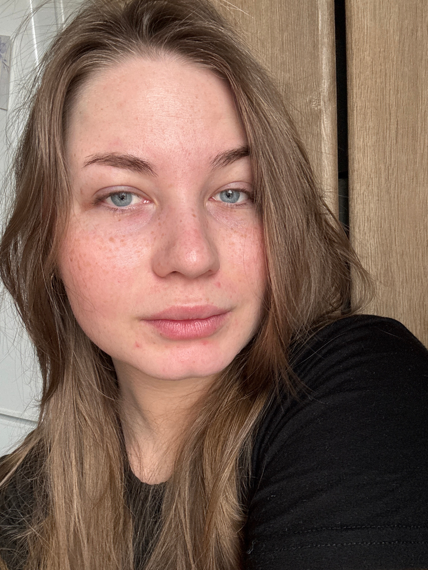 A close-up, portrait-style image shows a light-skinned young woman with blue eyes and freckles. She is lying down, with her head turned slightly to her right, which is the lower part of the image. She…read more