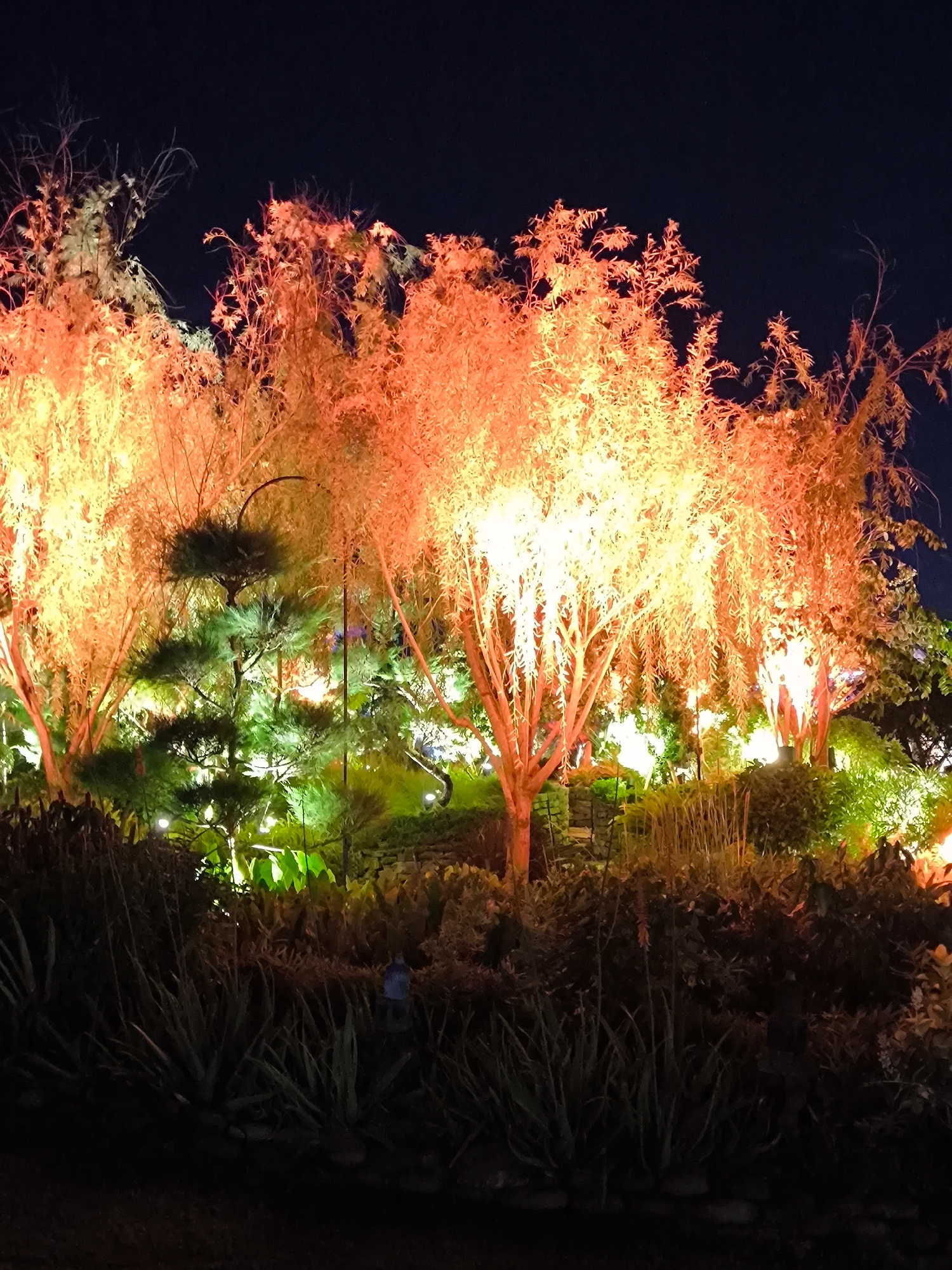 The media file presents a captivating nighttime scene of a garden or park in Kediri, Indonesia, beautifully illuminated by artificial lights. The upper and mid-ground are dominated by numerous trees w…read more