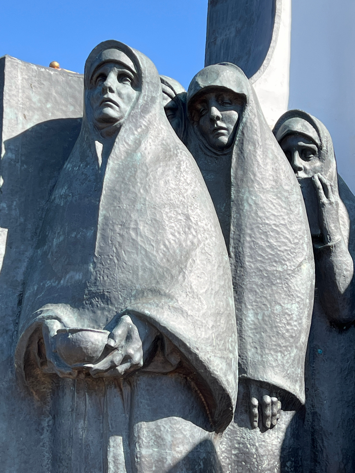 The image is a close-up of a section of the "Mourning Mother" monument in Minsk, Belarus. The bronze sculpture depicts three female figures, each with a sorrowful face, cloaked or hooded, and with the…read more