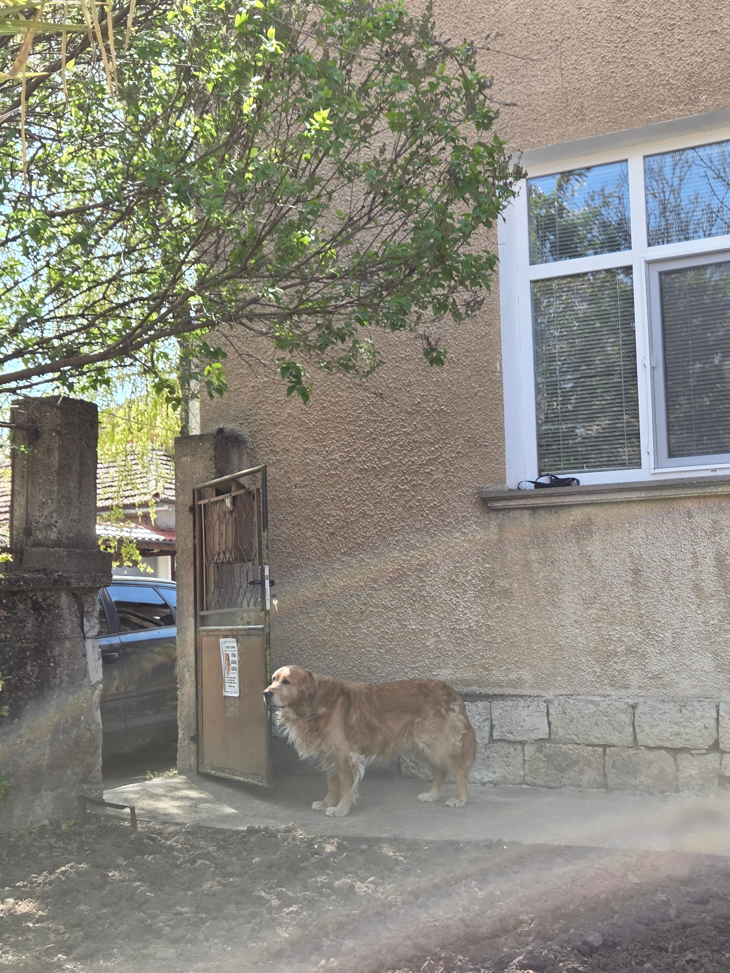 A medium shot depicts an exterior scene in Montana, Bulgaria. A golden retriever stands on a concrete path next to the exterior wall of a building. The wall is textured and light brown. A white-framed…read more