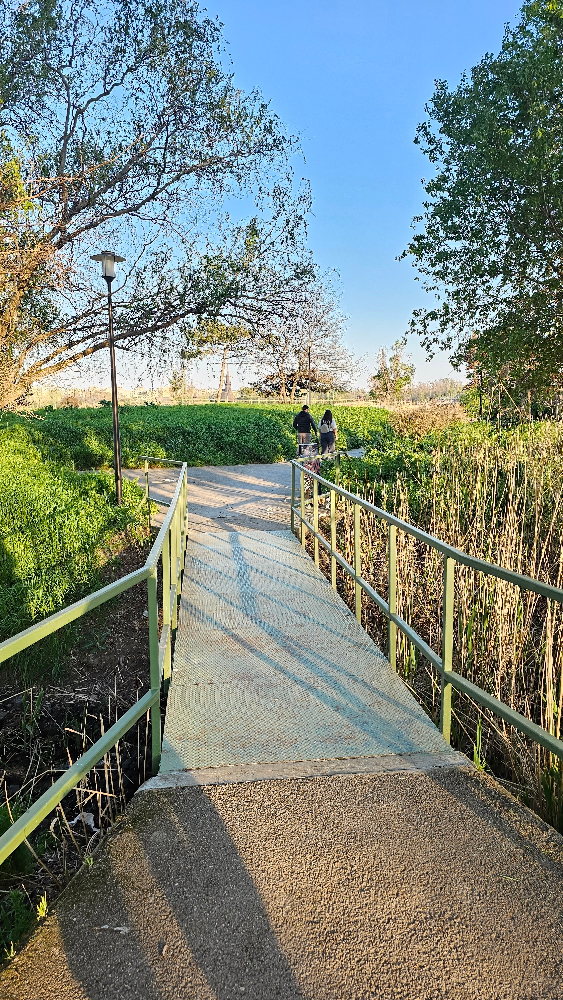 The image shows a pedestrian bridge with green metal railings spanning a grassy area in Constanța, Romania. Two individuals stand on the bridge. The landscape features tall grass, trees with bare bran…read more