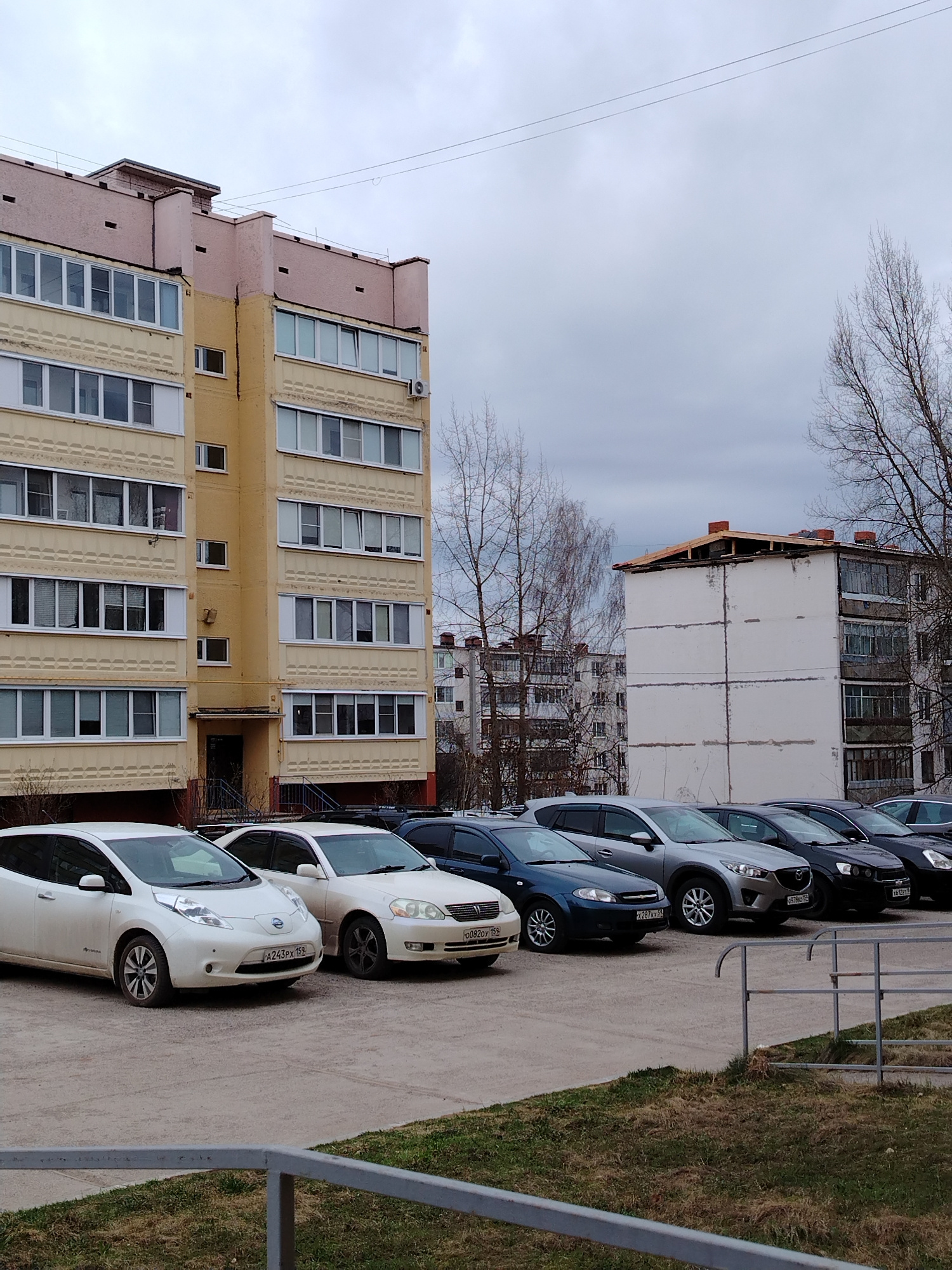 The image shows an outdoor scene in Noviy, Russia. A row of parked cars occupies the foreground of the scene. The cars range in color, with white and dark hues dominating. The license plates on the caβ¦read more