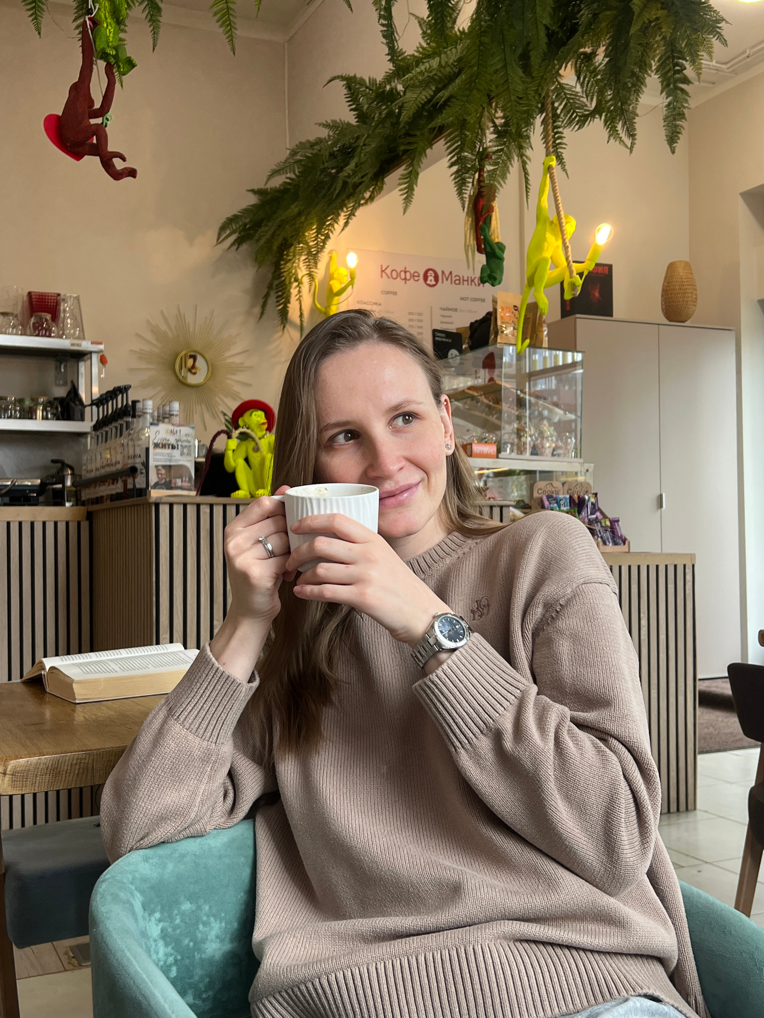 The image captures a young woman indoors, seemingly in a café or coffee shop setting. She is seated, holding a white coffee cup, and wearing a light brown sweater. A watch is visible on her left wrist…read more