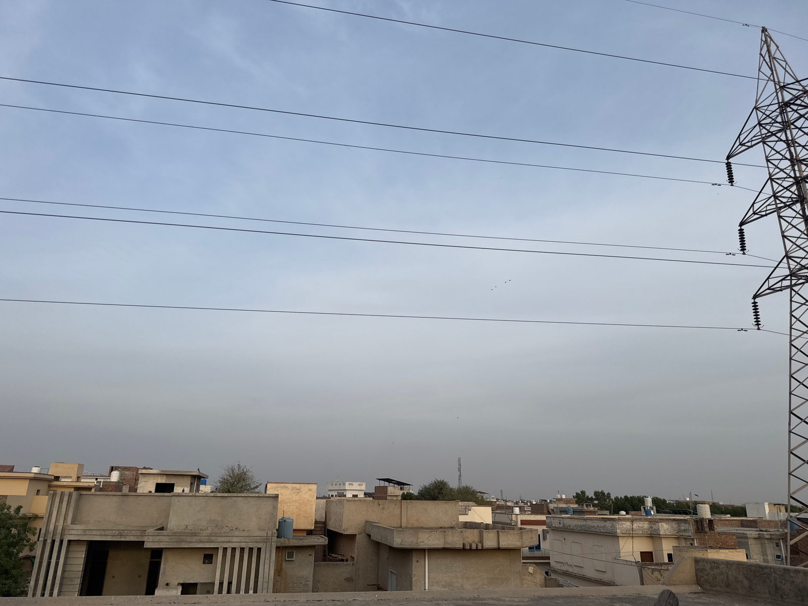 The image presents an expansive view of a residential area in Multan, Pakistan, under an overcast sky. The upper portion of the frame is dominated by a pale, cloudy sky, crossed by five prominent hori…read more