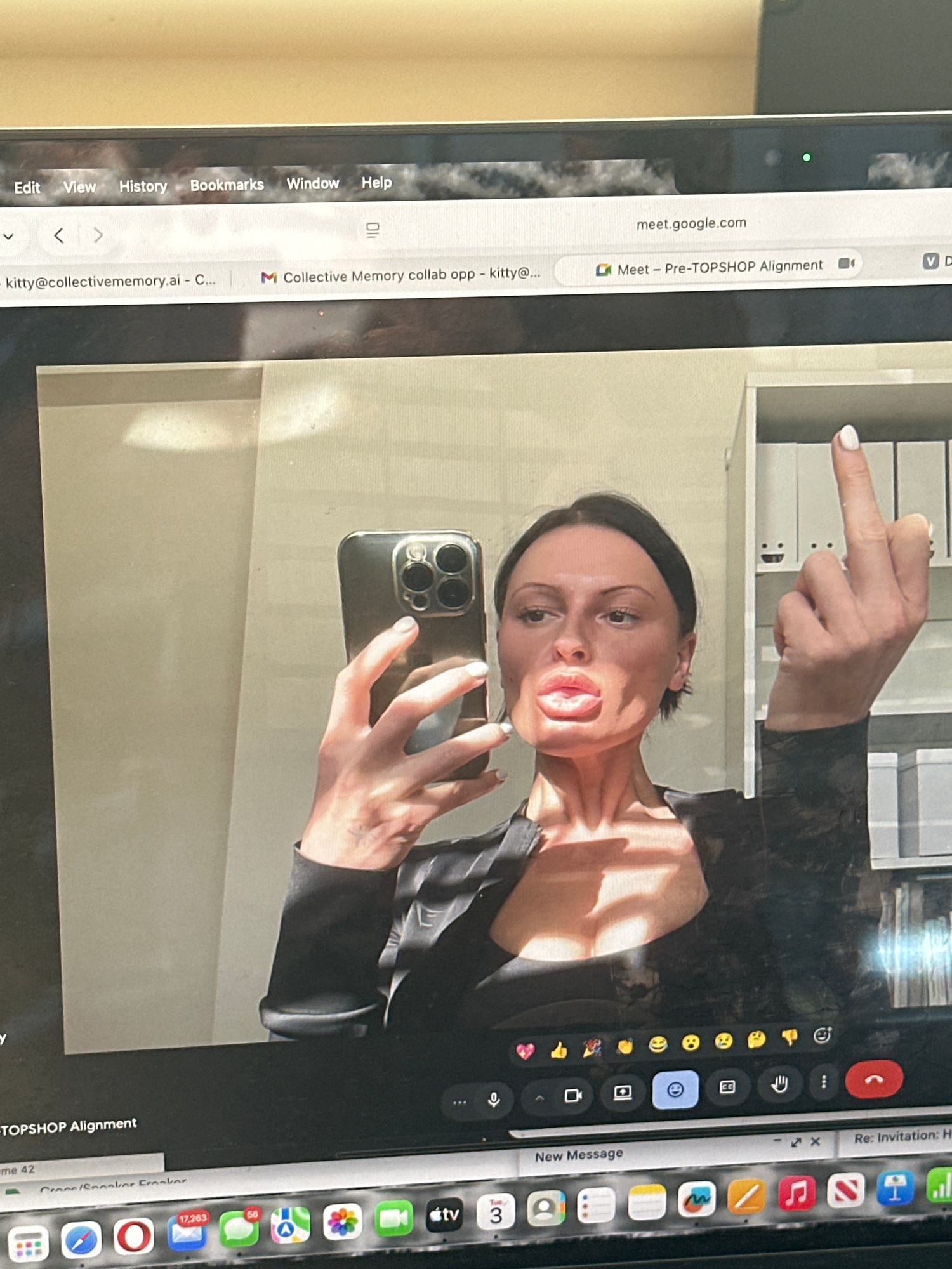 The image is a photograph of a laptop screen displaying a Google Meet video call. The screen's upper section shows browser tabs, including "meet.google.com" and a tab titled "Meet - Pre-TOPSHOP Alignmβ¦read more