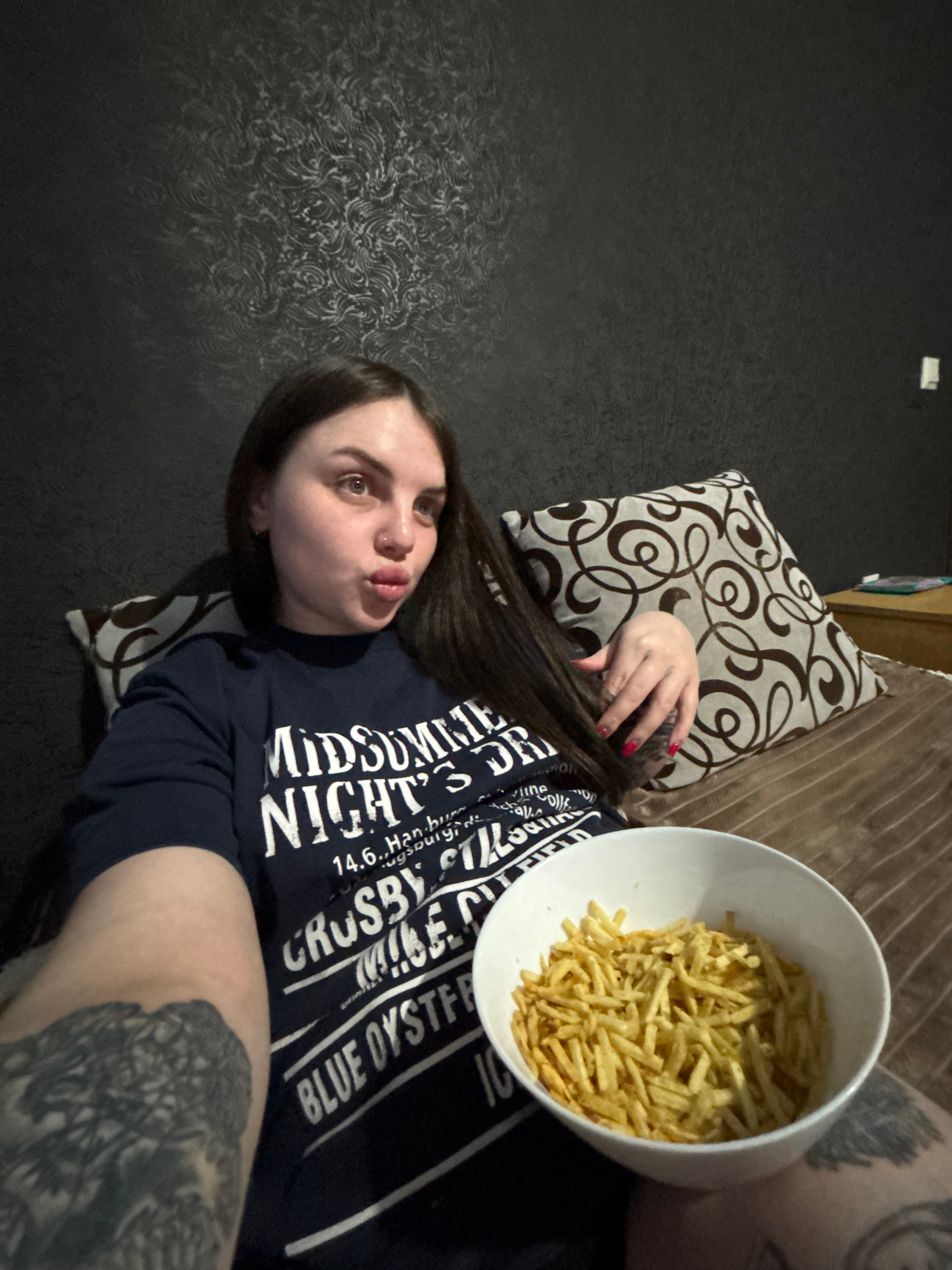 A woman lies on a bed or sofa with a decorative pillow behind her head. She is wearing a dark blue t-shirt with white text. She holds a large white bowl filled with shoestring potatoes or fries. The w…read more