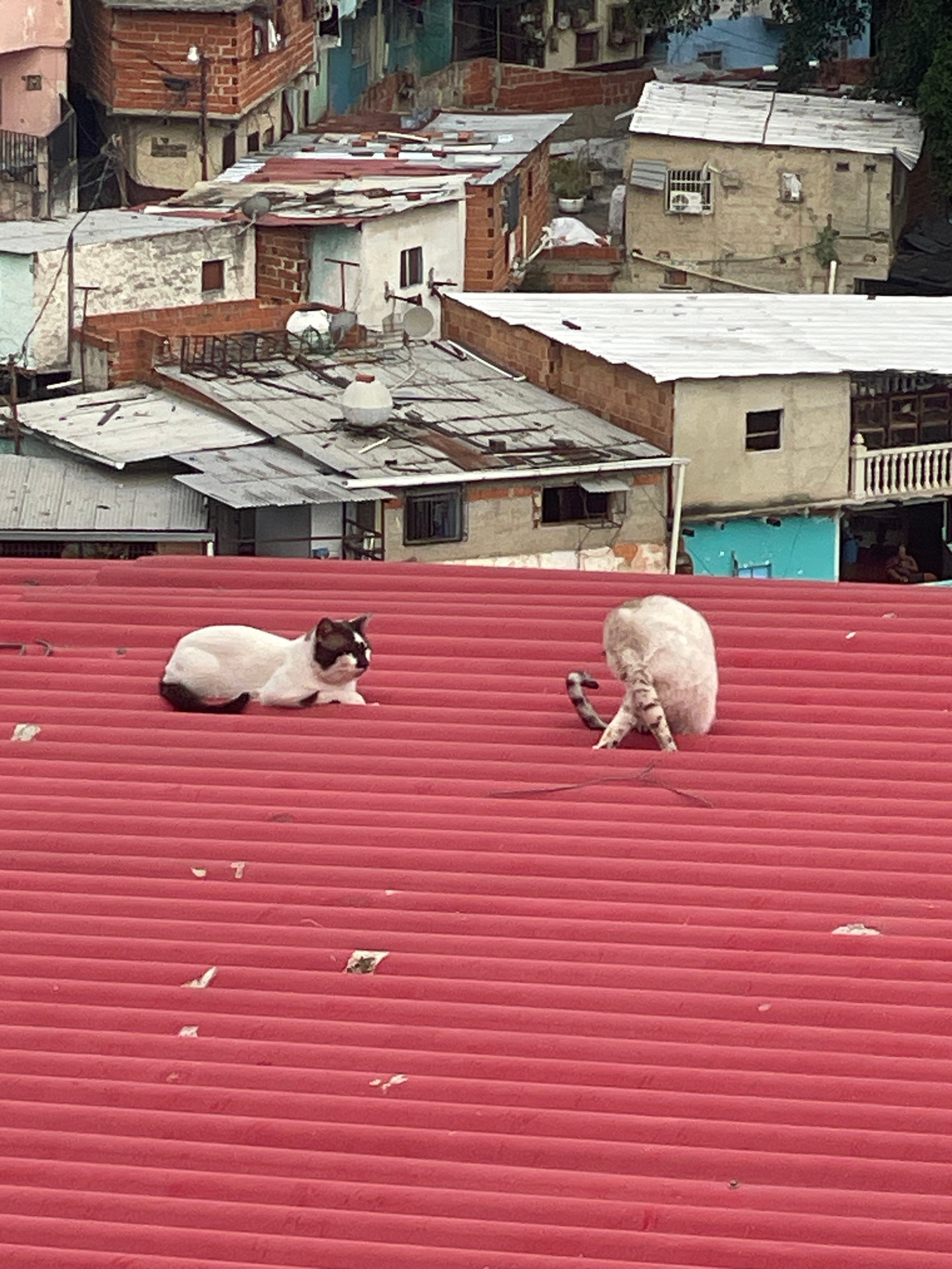 The image captures a scene in Caracas, Venezuela, showing a view of buildings and a red corrugated metal roof. Two cats are on the roof. One is partially visible, with its head and tail on the upper p…read more