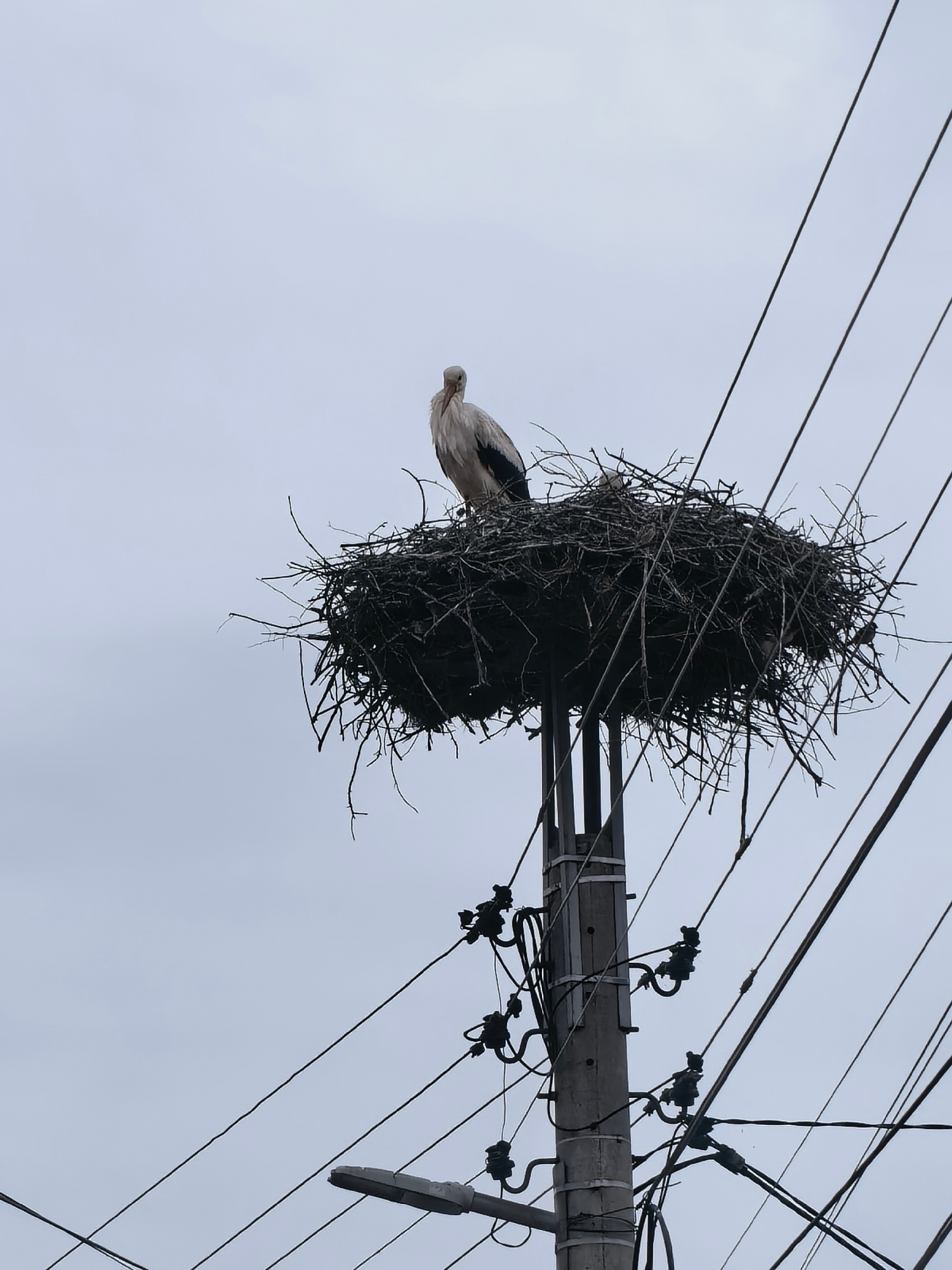 A stork stands in its nest atop a power pole amidst a network of power lines. The nest is large and constructed of sticks and branches. Below, electrical equipment is attached to the pole. The sky is…read more